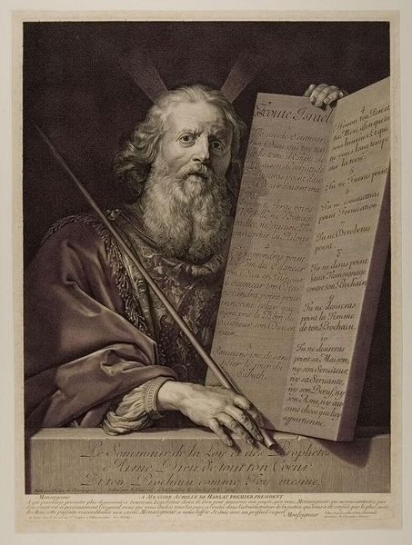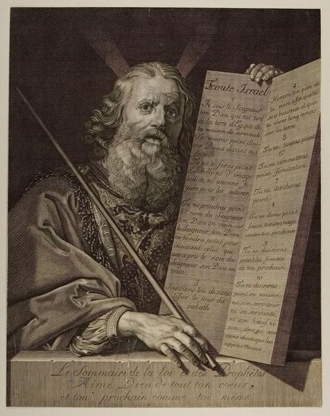 Editor: This is Jean Morin's "Saint Paulus," created sometime in the mid-17th century. There's something really compelling about his gaze; he seems to be trying to make a point. What do you read into this work? Curator: It's that urgency, isn't it? I think Morin captures Paul's intellectual fervor. He's got that book, clearly important, but it's secondary to the idea he's trying to communicate, the one he’s pointing to, almost shouting! It's like he's saying, "Listen, this is vital!" Editor: That's a great point. I was so focused on his expression, but you're right, the gesture is key. It brings a dynamic feel to the piece. Curator: Exactly. He's not just a figure in a book, he’s alive, engaged. And it makes us, the viewers, want to engage too, doesn't it? Editor: Definitely. It gives you a lot to think about, even centuries later.