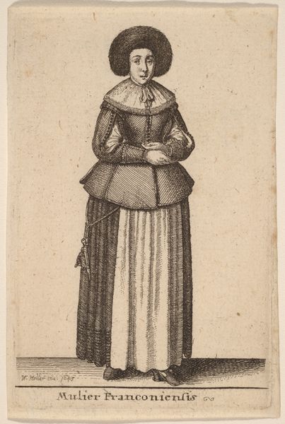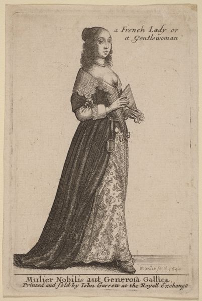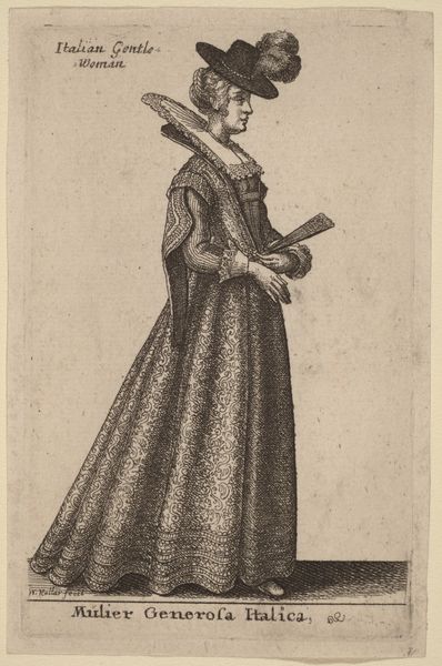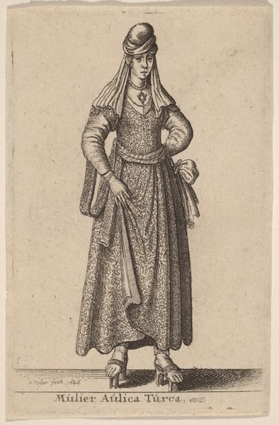 Wenceslaus Hollar etched this print in 1644, depicting a Greek noblewoman in Pera, now part of Istanbul. The composition is dominated by the figure, standing frontally with a static pose, her ornate dress, and her elaborate headdress. The use of fine, intricate lines creates texture and detail, particularly in the fabric patterns, giving a sense of depth and materiality. Hollar's meticulous attention to detail goes beyond mere representation; it signifies the woman's social status and cultural identity. The patterns on her dress and the layered ornamentation can be interpreted as a semiotic system, where each element conveys meaning about her background and position within society. We might consider how this depiction reflects broader issues of cultural representation and the gaze through which foreign cultures were viewed and documented. The print is a study in contrasts, using light and shadow to define form. This etching stands as an artifact embedded with cultural and philosophical implications, illustrating not just an image, but also the complexities of cultural exchange and representation during the period.