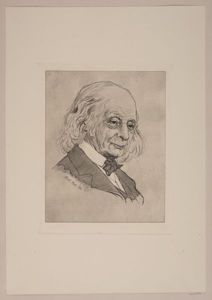 Curator: It's intriguing, isn’t it? This pencil drawing, simply entitled "Portret van Antonie Hendrik Gerrit Paul van den Es," was crafted in 1896 by Jan Veth. It's part of the Rijksmuseum's collection, and a fascinating example of late 19th-century portraiture. Editor: He has such kind eyes, don’t you think? It’s also somewhat severe. The meticulously detailed face emerging from the darkness gives a pensive, contemplative, even a little…stern vibe? It's beautiful, but not in an obvious way. Curator: Right, and what resonates deeply here is how Veth uses the portrait to underscore van den Es’s societal standing. His tailored suit, his neatly groomed whiskers – it all speaks volumes about bourgeois respectability. It mirrors the conservative values and structures prevalent during that era. It's about more than likeness; it's about reinforcing social order through visual representation. Editor: It's interesting that you say that, I wonder though...do you think there’s something subtly subversive happening here? Veth's capturing his serious look and yet, he feels oddly vulnerable. The soft pencil work gives the drawing this dreamlike fragility and almost hints at his own personal stories… a glimpse behind the curtain. Curator: That vulnerability is perhaps precisely the tension that gives the work its power! In looking closely at van den Es’ attire, he still adheres to those established codes of masculine identity, it shows how societal constraints shaped identity representation for men during this era, which limited ways they could express their individual experience and interiority. Editor: Yes! There's the societal expectations, right? and his reality, his actual, maybe melancholic and complicated self. He reminds me of so many men I've known: playing the role expected of them but subtly, desperately wanting to break free, maybe even hoping someone will notice. I think the sensitivity here shows that maybe the artist noticed that, which is touching to see. Curator: Ultimately, in this seemingly straightforward portrait lies an interplay between conformity and individuality. Veth captures the sitter but offers us a broader critique about the era in which it was created. Editor: Absolutely. Looking at it now, I feel like the drawing tells a secret that only paper and graphite can keep. I am strangely moved.