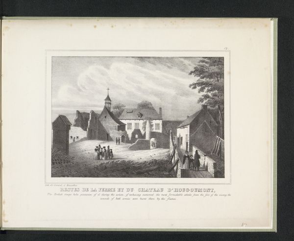 Curator: Cornelis Springer crafted this etching titled "Runderen met wagen voor elfde-eeuwse kerk" around 1860-1861. What strikes you upon seeing it? Editor: Initially, I'm drawn to the contrasting weight of the church and the ox-led cart; it gives the scene an almost mournful and sobering air. The looming church hints at enduring power juxtaposed with the small lives passing before it. Curator: Absolutely. Springer frequently engaged with architectural subjects. Considering that context and period, the choice of the Romanesque church in the cityscape grounds us in the tension of modernization against long-standing, immutable religious institutions, specifically their material presence in Dutch society and life. Editor: The cathedral, clearly built in the 11th century, is solid and steadfast. Note how Springer has situated it just slightly left-of-center, to give ample visual room for the oxen, laborers, and families near the center of the road. In that small group is a rich narrative about labor, and everyday resilience and strength. Oxen often symbolize steadfast determination and perseverance, reflecting the laboring class. Curator: Precisely! And viewing this piece through a social lens, we must consider these images are documents embedded with class assumptions and colonial gazes that naturalized unequal distribution of resources. The working class bears an economic load, yet remain excluded from its benefits and representation, carrying on century after century, load after load. Editor: The fog itself is incredibly interesting; how does that symbolism further the cultural reading of the overall cityscape scene? Does it symbolize a time of turmoil or perhaps confusion with how life is transforming so rapidly during that time in European history? Curator: Good question. The haziness serves a romantic trope by obfuscating, but I wonder also if the soft rendering does symbolic work to soften what in actuality would be rather severe socioeconomic disparity. Springer offers an image steeped in longing for a rural or medieval world on the cusp of disappearing and leaving groups disenfranchised and alienated from one another. Editor: The symbolism seems so apt. Curator: Indeed, the etching carries visual depth and also depth socially, encouraging dialogue on power, class and resilience through shifting societal frameworks. Editor: Agreed; such depth, making it both a striking composition and potent cultural object!