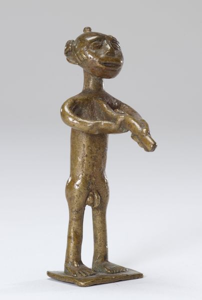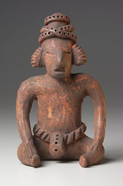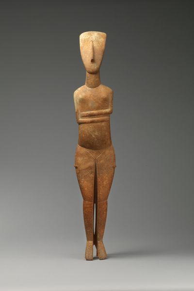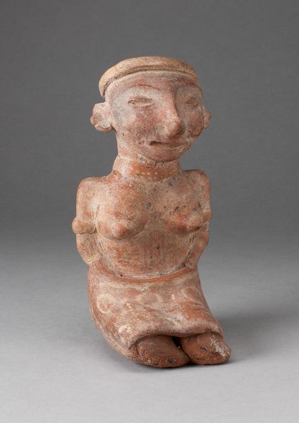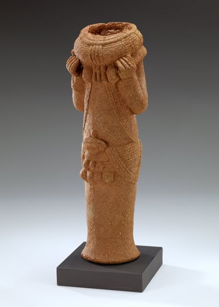This "Ntadi" figure, crafted by an unknown Kongo artist, presents a study in geometric forms and contemplative posture. The figure, likely carved from sandstone, immediately strikes us with its earth-toned palette and the tactile quality of the stone. Notice how the artist simplified the human form into basic shapes: the cylindrical torso, rectangular limbs, and a head adorned with a crown-like structure composed of cubic elements. This abstraction doesn't detract from the figure's expressiveness; instead, it amplifies the sense of introspection. The figure's hand supports its chin, a universal gesture of thought, while the other hand rests firmly on the hip, creating a dynamic asymmetry within the static medium. The interplay between curves and angles suggests a deeper philosophical dialogue about the balance between contemplation and action. The sculpture’s rough texture invites us to consider the materiality of the stone itself, a reminder of the Kongo people’s deep connection to their environment and ancestral memory.