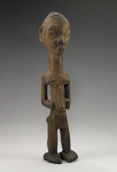 The stone used for this sculpture is relatively soft, so the artist could carve it almost as easily as wood. The figure was placed outside to demarcate the land of a clan, embellish the grave of a chief, and celebrate the legacy of the past. It represents a chief, recognizable by his hat, which once displayed four leopard claws (now missing), and his pensive pose—known as fumani, or “thinker of sad things”—which symbolizes wisdom, thoughtfulness, and authority.
