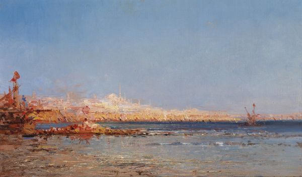 Editor: Here we have Dan Graziano's "Santa Monica Pier", an oil painting done en plein air. The composition is almost divided into the cool blues of the sea and sky versus the warm beige of the sand. There’s a dreamy quality to it. How would you interpret this piece? Curator: Well, considering plein-air painting, we see a focus on capturing a fleeting moment, an immediate experience of light and atmosphere. Piers themselves are interesting liminal spaces, structures built for leisure that extend into nature, inviting the commodification of natural spaces and resources. The lack of figures here is notable; what could that signify in relation to the pier’s usual purpose? Editor: Perhaps a commentary on tourism, then? Its absence highlighting its ever-presence. Is the artist trying to emphasize the architecture rather than the experience of visiting it? Curator: Possibly. Or maybe focusing on the inherent structure allows him to depict it for its architectural relevance. It offers visual cues—form and line, which draw our eye along the coastline and into the scene, but what’s not clear from the title of the work, but known because the pier is specific is it being done in California in particular – What kind of audience is intended for work portraying leisure this way in a certain locale? Editor: That’s really interesting. So, by presenting it so starkly and architecturally, they’re really framing how this particular leisure activity reflects the values of, say, Californians at the time the picture was painted, if they know the pier is in California. Curator: Precisely! We’re seeing the pier as an icon, potentially embodying societal aspirations for recreation and access. But also to what kind of class are they alluding to? It requires a viewer to be able to recognize it as leisure time instead of it coming off as part of someone’s work. Editor: That perspective really changes how I view the painting; thank you. Curator: And thank you! Thinking about these factors deepens our understanding of the pier’s societal role as well as how painting is perceived when the average viewer engages with it.
