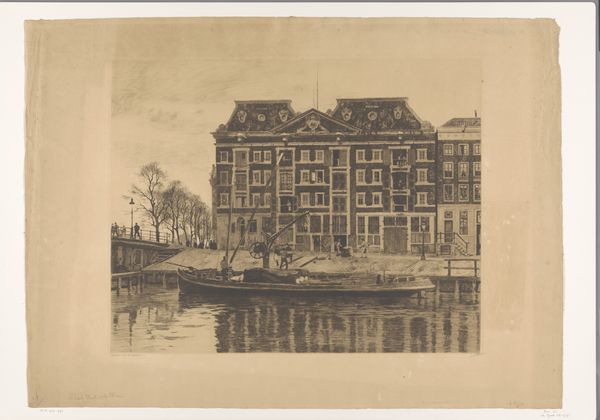 Curator: What a wonderfully textured image! This is "Huizen aan de Prins Hendrikkade in Amsterdam," an etching created between 1905 and 1907 by Wijnand Otto Jan Nieuwenkamp. Editor: My first impression is the sense of quiet industry. There's an evocative depiction of labor here; the waterways feel active, the architecture suggesting a bustling trade environment of that time. Curator: I agree, that industry is deeply embedded within Amsterdam’s symbolic framework. The buildings almost rise out of the water, reflections creating an intimate connection between human activity and nature, hinting at commerce and exchange within a defined urban landscape. Editor: Look at the etching technique; you can feel the artist’s labor in the dense network of lines creating shadow and depth. There's a clear engagement with materiality - the textures almost tactile, especially on those houseboats, bringing us back to labor and commerce. Curator: The waterways and boats, recurring motifs, represent connection and movement— the lifeblood of trade. Beyond the architecture, notice the trees – barren but alive – they introduce an almost melancholic note, representing resilience and perseverance. Editor: And this points back to materiality as resistance. The artist chooses etching—a printmaking technique where the process of production makes visible its hand-made character— challenging the commodification and re-circulation that can come to overshadow the artistic gesture. Curator: Absolutely, etching allows for an engagement with historical Dutch symbols and themes within a new industrializing era. Through the rendering of such icons, it anchors Amsterdam’s identity amidst modernization. Editor: Examining Nieuwenkamp’s print, I understand labor not just as representation but also as material engagement—a reminder that art, too, involves manual making and an historical framework. Curator: The image serves as an echo of cultural memory and how the city evolved, all contained within a simple etching. Editor: Yes, a quiet reminder of how things are constructed, both materially and symbolically.