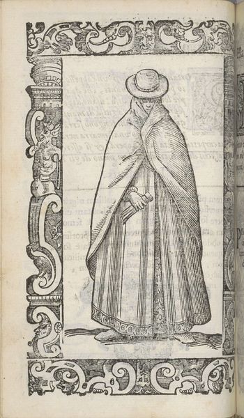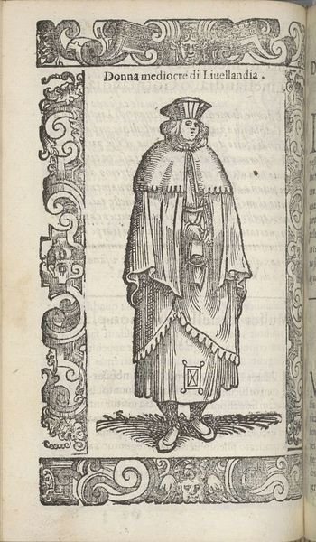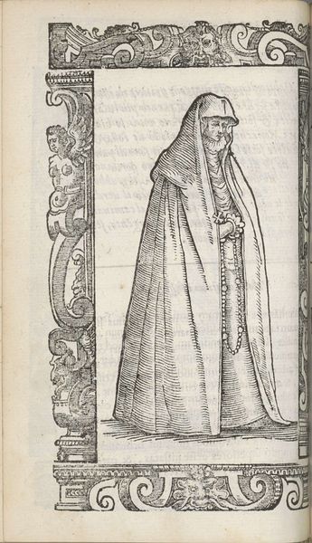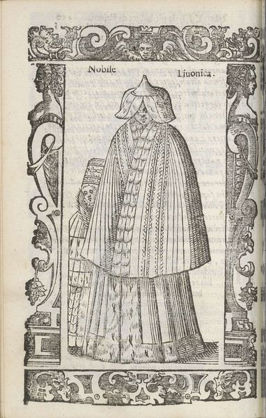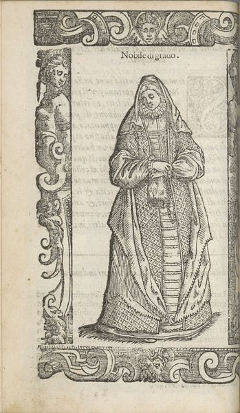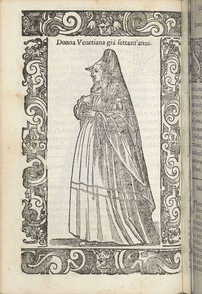 Editor: This intriguing pen and ink drawing is titled "Sposa di Svetia," dating back to 1598. The artist is Christoph Krieger. It depicts a woman in elaborate dress. I’m immediately struck by the subject’s imposing presence; she feels at once powerful and strangely remote. What do you see in this piece? Curator: Well, let's look closely at that headdress and the elaborate fur. Doesn't it evoke something of the sacred, a crown alluding to ritual and a kind of protective vestment? "Sposa di Svetia"—"Bride of Sweden"— but the way she's presented, could she be an offering or a figure participating in a symbolic marriage? What emotional associations come to mind when you consider this image? Editor: Sacrifice, perhaps? Or maybe royalty cloaked in cultural expectations. It feels...weighted down by history. What’s the significance of placing the drawing within this frame of ornamented border, especially the little angel at the top? Curator: That’s a beautiful observation! Think of how frames in art often function as liminal spaces, transitions from the real world to the symbolic realm within the image. Krieger is literally embedding the "Sposa" in layers of meaning. What does that border imagery evoke for you, knowing this is a Swedish bride? Does the classicizing detail of the little angel speak to the infiltration of European culture? Editor: I hadn't considered that. It definitely shifts my perspective. I was focusing solely on the figure, but the border almost feels like another layer of cultural narrative. Curator: Precisely. It's a cultural palimpsest. These visual symbols speak volumes, creating an interesting narrative about cultural exchange and perhaps even tension. A wedding represented not just a union but the convergence of societal and historical forces. Editor: So, the image is not just a portrait, but a carrier of cultural memory? I see so much more here now, thanks! Curator: Indeed! And by examining the language of its symbols, we gain insight into the enduring narratives that shape us.