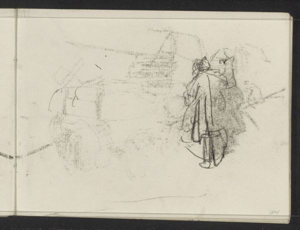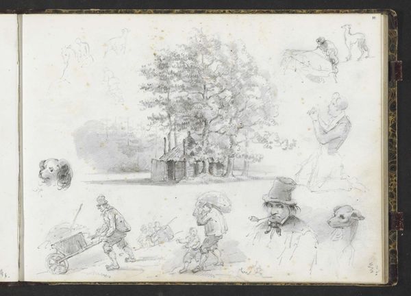 Editor: This work is titled "Boom, kop van een kind en een straatscène" by Lambertus Lingeman, and the provided date range is 1839 to 1894. It seems to be made with pencil, maybe with some colored pencil on paper. It looks like a sketch, a glimpse into daily life... What captures your attention in this seemingly simple piece? Curator: This is an interesting document. Look closely at the way Lingeman employs pencil—the graphite itself. See how it is used to depict not only the figures and the landscape, but also class divisions within the mid-19th century Dutch society? Editor: Class divisions? Curator: Absolutely. Observe the figure in the high hat, presumably middle or upper class, set apart from the gaggle of children nearby. Now, consider the paper itself - likely mass produced but still a commodity. Think about who had access to these materials, who could afford the leisure to sketch such scenes. Lingeman’s work becomes not just a representation of the street, but a record of a specific mode of production and consumption. Editor: That makes a lot of sense. So, it's not just about *what* he's drawing, but also the *how* and *why*, considering the materials and context. It gives new weight to a humble sketch. Curator: Precisely. Even the "unfinished" quality is relevant. It implies the everyday, the transient nature of experience, captured through the readily available technology of pencil and paper. It reflects the emerging industrialized world and how it shaped artistic practice. What do you make of the tree itself? Editor: I originally saw it as just background scenery... Curator: But doesn’t the rendering also show access to natural space in a developing urban environment? It all builds a compelling commentary about materials, production, and lived experience. Editor: This approach really opens up new ways of thinking about even seemingly simple sketches. I see how the context and materials become just as important as the subject. Thanks for illuminating that for me. Curator: My pleasure. Considering these factors transforms our understanding and invites deeper appreciation for the artwork’s layers of meaning and significance.