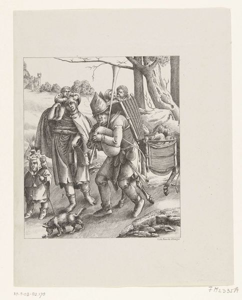 Editor: This is "Ballingschap," or "Exile" in English, an engraving made sometime between 1533 and 1567 by Enea Vico. It's quite small, and rendered with such fine lines! What I notice right away is this central figure, this bearded man holding a bird. How would you interpret this piece? Curator: This image pulses with symbolic resonance. Exile itself is not merely physical displacement, but a severance from identity, history, and belonging. The man's clothing suggests a certain status, perhaps even royalty, now stripped bare. Consider the bird; what does it signify to you? Editor: I suppose the bird on his wrist is a falcon. Maybe it signifies the freedom that he no longer has, or the high status that has been stripped away, like you said? Curator: Precisely! Falcons often symbolized nobility and freedom. The bird's captivity with him can suggest a loss of status or power, a kind of shared fate. The Latin inscription "EXTORRIS PATRIAM DVLCESQ[UE] REUNQVO PENATES EXILIVM" tells us he is banished from his fatherland. What emotions do you feel as you look at this image? Editor: Sadness and maybe some empathy? I see a fallen man, no longer who he once was. He's in exile, without a home. Curator: Exactly. The engraving captures the somber reflection on loss of home, status and identity. But in art historical symbolism there is also endurance. What survives loss? Consider the symbolic power of exile as a test to character and perseverance, perhaps even rebirth. Editor: It is interesting to see how the symbolism elevates the artwork, layering new insights. Curator: Agreed, reflecting upon this historical image prompts deeper understanding, revealing the story behind visual language that art embodies and passes down over centuries.