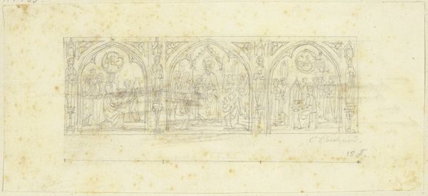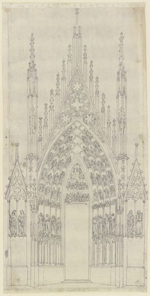 Curator: Here we have a drawing on paper called "Custom windows," by Karl Ballenberger, housed right here at the Städel Museum. Editor: My first thought is how ethereal it feels. It’s a simple drawing, yet the interplay of lines creates this almost otherworldly geometry. It's like looking at a fragment of a dream. Curator: Indeed. The geometric forms, primarily arches and pointed figures, give the composition structure and rhythm, as well as a sense of balanced symmetry. It invites us to look at the relationship between the lines themselves. Notice the subtle differences in pressure creating variation of the outlines? Editor: And it brings to mind sacred architecture immediately—the shapes recall Gothic windows, a potent symbol of spiritual yearning. The delicate lines feel like echoes of grand cathedrals and medieval stained glass. Perhaps it invites a certain kind of symbolic ascension. Curator: The lack of vibrant colors found in the windows themselves adds a kind of austere quality to the overall structure, focusing the viewers attention purely on structure. Without date of creation, one could also assume the reference to older works that had stained glass works from centuries ago. Editor: It does present an almost ghostly representation of craftsmanship in architecture as if capturing an old cathedral is only visible with pen lines on paper. Like looking through layers of architectural memory that are not to scale nor functional but emotionally loaded with an era where architectural achievements took new hights in geometrical problem solving. Curator: Precisely. By removing all that material richness and visual embellishments, the artwork asks us to consider structure first. We see the underlying syntax of a very familiar sacred cultural image stripped down into form and shapes. Editor: Ultimately, I see a humble medium transformed into a vehicle for capturing complex spiritual meaning embedded in architecture throughout European History. Curator: It demonstrates the power that abstract composition and geometry hold on human emotion, transcending beyond surface-level religious iconography. Editor: It certainly adds another rich layer when visiting architectural works displayed at our museum, and to understand architecture history is one aspect, but understand how deeply people valued and gave the religious implication, is very moving.