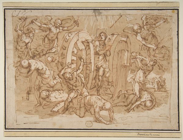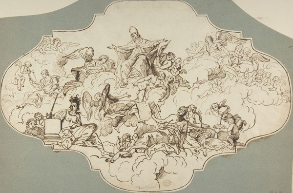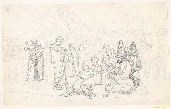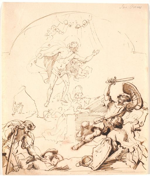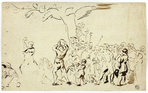 Charles Kirkpatrick Sharpe created this pen and ink drawing, Oberon and Titania, from A Midsummer Night's Dream, sometime in the early 19th century. At first glance, the work seems to be a whimsical depiction of Shakespeare's fairy world, yet Sharpe’s meticulous, almost obsessive, linework creates a scene that feels both enchanting and unsettling. The composition is densely populated, filled with a multitude of figures, each rendered with intricate detail. Sharpe employs a delicate cross-hatching technique to build form and texture, giving the drawing a palpable sense of depth and shadow. Look at how the artist destabilizes established meanings by juxtaposing the ethereal Titania floating above with the more grounded figures below. The drawing's power resides in its ability to render the familiar strange, challenging our understanding of narrative and representation. Its formal qualities not only serve aesthetic purposes but also engage with larger cultural discourses around Romanticism and the supernatural.