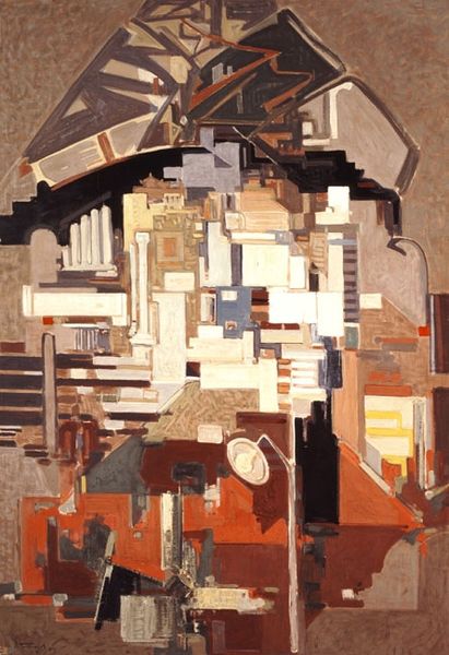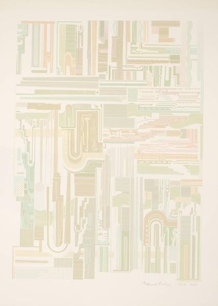 Curator: Here we have Sir Eduardo Paolozzi's "Leonardo," part of the Tate Collections. Editor: My first impression is how muted the palette is; it's almost soothing, despite the chaotic composition. Curator: Paolozzi was deeply engaged with technology and popular culture. This piece seems to recall the visual language of circuit boards, or perhaps city planning. Editor: Absolutely, the repeated motifs and geometric forms might symbolize interconnected systems or perhaps the psychological impact of industrial design. It's interesting that he titles this "Leonardo," as if drawing a line between Renaissance invention and modern technology. Curator: The layering of forms creates a sense of depth, almost like peering into the workings of a machine. I can't help but wonder about Paolozzi's own relationship to the rise of technological advancements. Editor: It's a powerful image, holding both the promise and potential alienation of our increasingly technological world. The muted color scheme adds a layer of melancholy, doesn't it? Curator: It does suggest a sort of detached observation, a commentary on the pervasive influence of these systems in our daily lives.