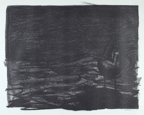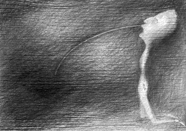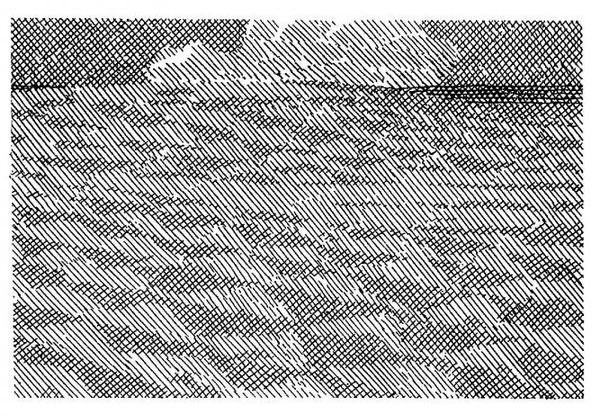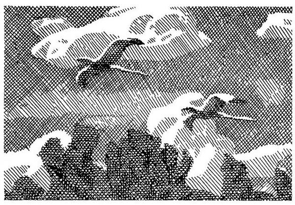 This illustration by Hryhorii Havrylenko is for Yevhen Gutsal's collection of short stories, "In the Stork Village". Dominated by a dense crosshatch of lines, the image creates a textured field that both defines and nearly obscures the central figure of a small bird. The stark contrast between the white chick and the dark background draws immediate attention, evoking a sense of fragility against an almost oppressive environment. Consider how the repetitive, grid-like structure of the background destabilizes the traditional figure-ground relationship. The graphic strategy almost camouflages the chick. This interplay could reflect the narratives within Gutsal's stories, possibly engaging with themes of displacement or the hidden aspects of rural life. The use of such a structured pattern invites us to explore how the artwork challenges fixed meanings, prompting a deeper engagement with its visual and thematic elements.
