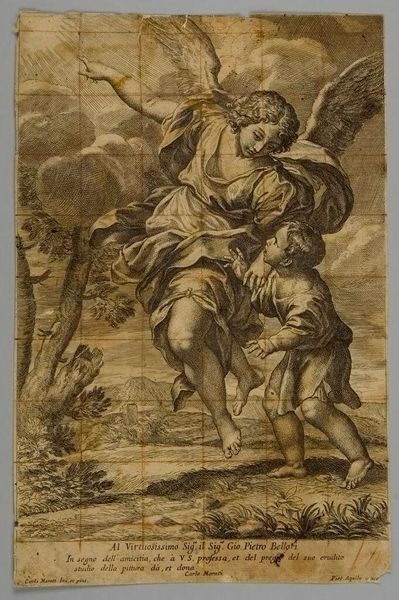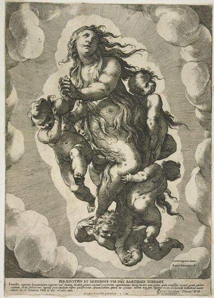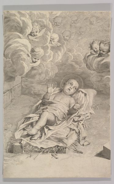 Editor: This is Claude Mellan’s "Infant Christ Lying on a Bed of Straw." It’s quite moving, but those cherubic faces emerging from the clouds seem to carry a sense of sorrow. What symbols do you see at play here? Curator: Indeed. Straw is a symbol of Christ’s humility, his willing embrace of poverty, while the swaddling clothes prefigure the burial shroud. The angels act as witnesses to the event, representing divine acknowledgement. Editor: Witnesses to both birth and death, then? Curator: Precisely. Consider how Mellan uses light and shadow. Light, here, is not just illumination, it's revelation. It exposes both divine innocence and earthly vulnerability. Editor: I never thought of straw carrying so much meaning. Curator: It’s a reminder that even in the humblest of circumstances, divinity can be found, and that symbols carry profound cultural weight.