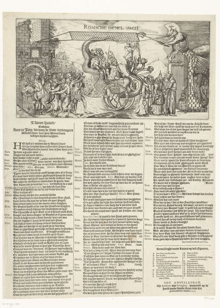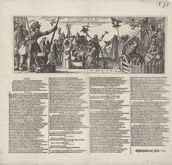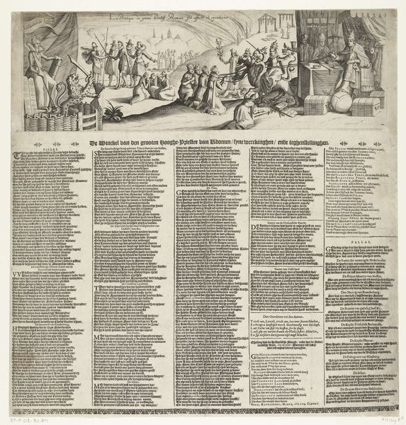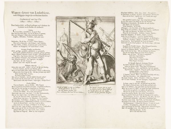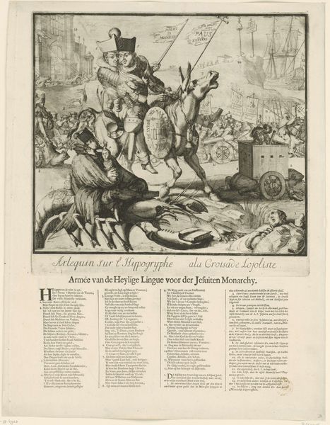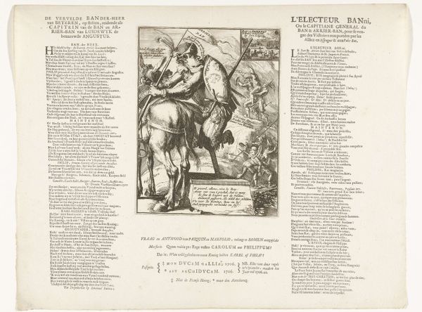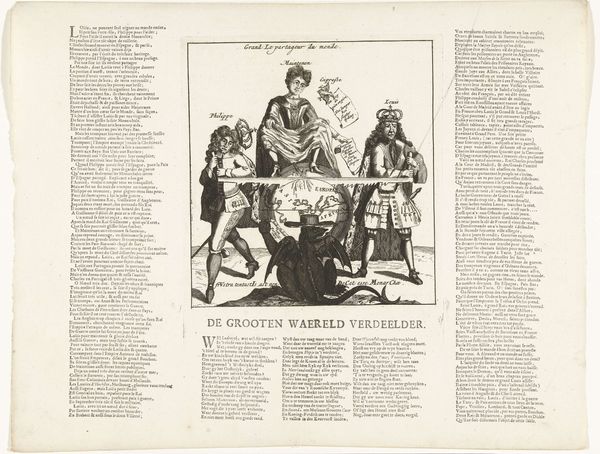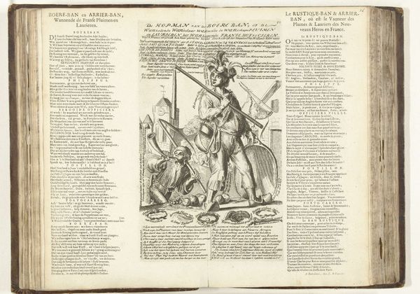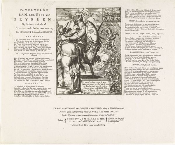 Editor: Here we have an engraving from 1706, “Spotprent op de Franse boerensoldaten, 1706,” which translates to “Cartoon of the French peasant soldiers” attributed to an anonymous artist at the Rijksmuseum. I'm immediately struck by how the central figures are framed, almost mocked, while surrounded by text. What kind of story does this visual narrative tell? Curator: The piece speaks volumes about the complex socio-political climate of its time, positioning "peasant soldiers" within a larger discourse of power and representation. This image likely functioned as propaganda. Consider, who is being ridiculed here, and what does that ridicule signify? Editor: It looks like the artist is poking fun at French soldiers, perhaps portraying them as unskilled and unsophisticated, judging by their somewhat clumsy appearance. Curator: Precisely. This connects to the tradition of depicting the "other" in art. How does caricature function as a tool for social commentary? Is this just lighthearted humor or does it reflect deeper societal anxieties and prejudices regarding class and national identity? Editor: I see. It’s not just about making fun, but about reinforcing a sense of Dutch superiority by belittling the French. The image reduces them to caricatures and affirms power dynamics through the device of mockery. Curator: And that brings us to considering the historical context, the specific conflict this caricature refers to. Understanding this provides another layer to interpreting how art participates in constructing national identities. So how might contemporary theory inform our reading of this piece? Editor: This makes me realize how art can actively shape perceptions of different social and national groups. It's not a neutral reflection, but a biased representation meant to sway public opinion. Curator: Exactly. By questioning the motivations and intended audiences, we unveil the art's embedded power dynamics. We understand not just its historical moment but also how visual rhetoric perpetuates throughout history.