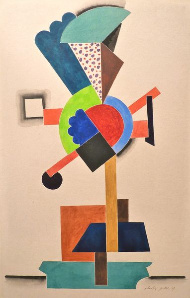 Editor: Here we have Sándor Bortnyik’s "Composition II, Pink and Blue," an acrylic painting created in 1921. Its arrangement of geometric shapes is so direct, it almost feels like an architect's blueprint! How do you interpret this work? Curator: It strikes me as a visual poem. Bortnyik's arrangement of shapes and colours sings a song of the modern world. The influence of the Bauhaus is unmistakable; you can sense that pursuit of universal harmony. Tell me, do the colours evoke anything for you? Editor: I do think the pinks and blues bring a softness, almost a dreamlike quality, that contrasts with the strict lines and shapes. Is there a specific message Bortnyik was trying to convey? Curator: Perhaps not a message so much as a feeling, a way of seeing. Abstraction like this lets us wander through the canvas. For me, there's a sense of optimistic construction, that by building in an ordered way we can find a better way of living. Do you get that too, or something else? Editor: I can definitely see that optimism. It’s inspiring how these artists sought to reshape the world around them, one painting at a time. Curator: Indeed! And through his choice of forms, lines, and colour, he really lets you experience it on an intuitive level. It seems that Bortnyik speaks a language we all can understand, whether it be our emotions or intellectual mind! Editor: Well, thanks for making the language of this painting clearer to me. I feel like I have a new pair of artistic glasses to view this style now! Curator: Absolutely, anytime!
