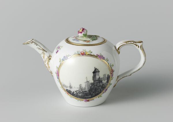 Editor: This is "Theepot," made between 1777 and 1790 by the Porseleinfabriek Den Haag. It's earthenware. What strikes me is the delicate scene painted on it. How do you read this piece? Curator: From a materialist perspective, the teapot becomes fascinating. Think about the production process. Earthenware production involved skilled labor. The mining of the clay, shaping the form, painting those scenes—all tied to specific social and economic relations of the time. Editor: So it’s not just a pretty object but a product of its context? Curator: Exactly. We can ask: Who owned this teapot? What did it mean to them? Was it purely decorative, or was it part of a ritual of tea consumption connected to global trade and colonial power? And what does the Rococo style of the landscape tell us about their values? It certainly emphasizes leisure and an idealized nature. Editor: That’s a great point about leisure! How does that challenge the boundaries of "high art" and craft, though? Curator: Often, craft objects are devalued because they are "functional." But consider the artistry, the labour invested in it. By focusing on materiality, we recognize the significance of all forms of making and consumption, seeing this object in relation to larger industries. It flattens hierarchies imposed onto creative practices. Editor: So, understanding the material and production helps us unpack the object's historical role, and what the function of the landscapes means about class and labour in society at the time? Curator: Precisely. It forces us to confront power dynamics embedded even in seemingly innocuous objects, challenging aesthetic standards based only on beauty rather than history, labour and socioeconomic elements. Editor: This has really given me a new lens for approaching decorative arts! Curator: Me too! It is always fascinating how production elements give access to an alternative comprehension.