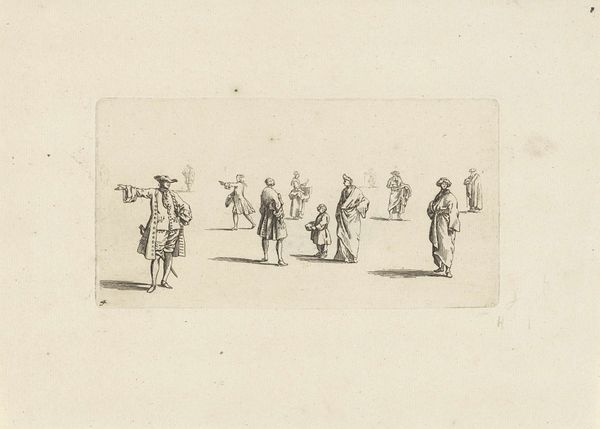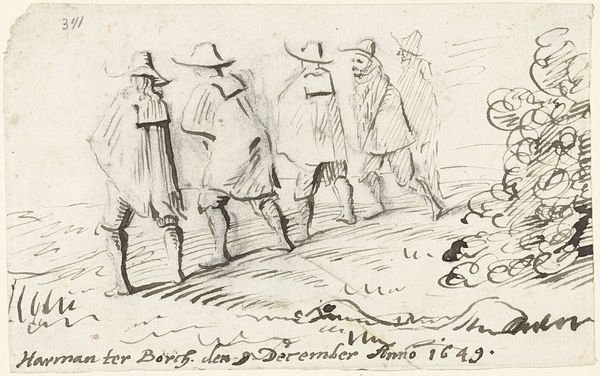Curator: This playful sketch before us, "Kinderen spelen het spel Kruip door sluip door," which translates to "Children playing the game Crawl Through, Sneak Through" is a creation of Harmen ter Borch, likely from around 1650. Editor: It’s quite lovely, capturing the giddy chaos of children at play! There's something raw and immediate about it, like a fleeting memory captured on paper with quick strokes. The sparseness invites imagination. Curator: Ter Borch rendered it in pen and ink, and what strikes me is the fluidity, the sense of effortless movement despite its simplicity. It suggests he caught the essence of the game in action. Considering that paper would have been relatively precious back then, what do you imagine was the occasion for Ter Borch to sketch this? Editor: That's a key question. Paper wasn't cheap, and ink-making was a whole process—so this wasn’t idle doodling. He’s observing, right? Taking note of not just the gestures, but also the folds of their clothes, the particular hats they are wearing...he may be recording information. Almost a pattern-making exercise of future possibilities for the characters of people he may paint. Curator: Perhaps. The loose, almost whimsical lines do remind me of a sketchbook exploration, a kind of visual note-taking of the everyday world around him. Editor: It makes me wonder, too, about the societal context. What kind of labour are their clothes signalling, what did it mean for the children themselves at the time the game took place? Children at that time would probably work… Curator: A poignant contrast to the innocence of the game they play. There is something about it that brings on this feeling of nostalgia for something simpler and less regimented. Editor: Exactly. We can see, on the one hand, the evidence for an increasingly global material world around them, but on the other the simple means of children making merry of nothing. What a dichotomy. Curator: The materiality, that you’re drawing out now, almost invites an invitation into ter Borch’s 17th-century world, doesn't it? These children and their simple game come to life on paper, even through all these centuries, reminding us of our shared humanity. Editor: Absolutely. It reminds me to pay closer attention to the seemingly small and mundane moments of life because they’re often richer in material history and emotion than the grand pronouncements we so often privilege.