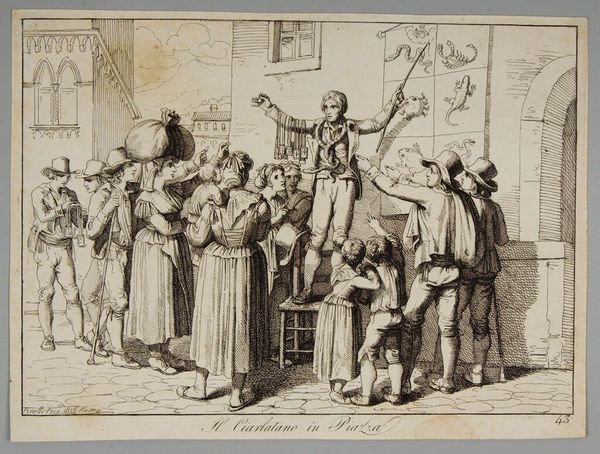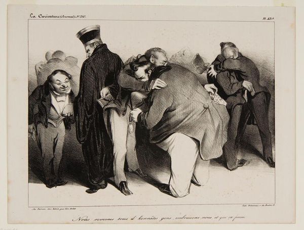 Curator: This lithograph by Honoré Daumier, entitled "For a poor American, please," really strikes me as a rather pointed piece. It's stark, raw. Editor: It's a brutal commentary, isn't it? The contrast between the beggar and those smug, well-fed figures is jarring. It feels particularly pointed, especially considering it seems to critique the concept of American wealth and philanthropy. Curator: Absolutely. It's like Daumier is saying, "Look at this charade." There's an almost grotesque quality to the exaggerated features of the wealthy. I almost feel sorry for them. Editor: I see it as more of a mirror reflecting the inequalities of the time, those with power and resources turning a blind eye. And let's not forget Daumier's own radical politics and the context of post-revolutionary France. Curator: Still, there's a strange sense of empathy. Perhaps I'm projecting, but I can't help but feel a flicker of sympathy for the burden of that supposed opulence. Editor: Perhaps, but the enduring power of this piece lies in its ability to provoke discomfort and force us to confront those uncomfortable truths about wealth, poverty, and power.