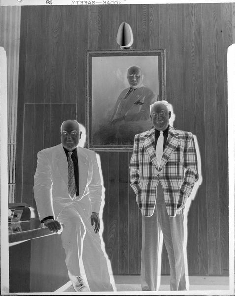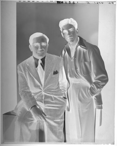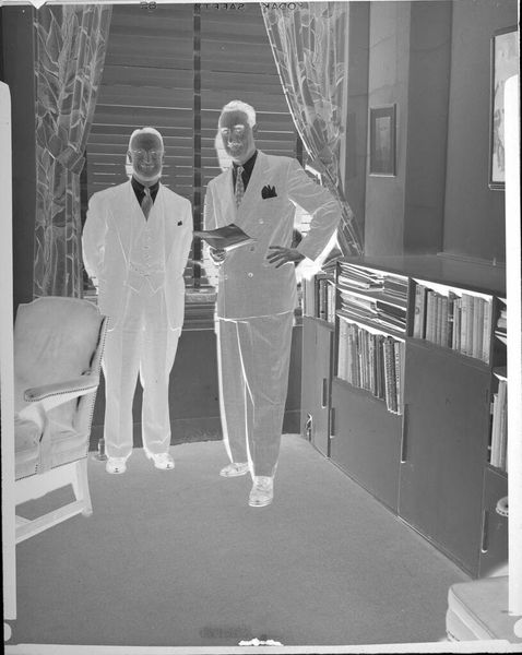 Editor: This is "Untitled (two men standing in office)" by Peter James Studio. It's a black and white photograph. They’re both wearing suits and the one on the right is holding what looks like a document. It gives off a feeling of mid-century corporate America. What historical narratives do you think this image speaks to? Curator: Considering the power dynamics inherent in corporate spaces, particularly during the mid-20th century, this image invites questions about masculinity, class, and access. How does their attire, and the setting of an office, contribute to a reading of privilege and authority? Editor: It's true, the suits project a certain image, almost like a uniform of power. Curator: Exactly! And who was typically afforded that privilege during that period? This photo is more than just an image; it’s a conversation starter about the structures that shape our society. Editor: I never thought about it that way. Thanks for the insight.