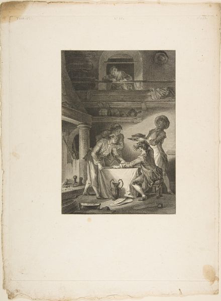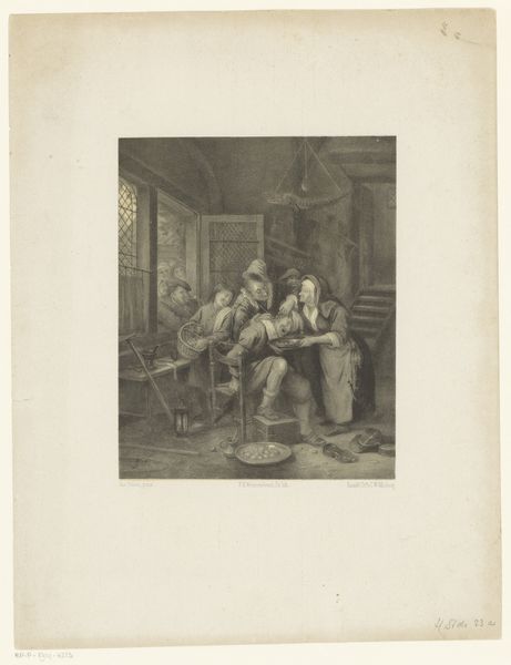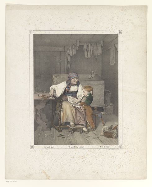 Editor: This watercolor, titled "Vrouw en jongen bij een leraar in een schoolklas," attributed to an anonymous artist and dating from 1825-1875, has a strangely intimate feel, despite the classroom setting. I am really struck by how muted and earthy the colors are; it contributes to an introspective mood. What are your initial impressions, particularly regarding its compositional choices? Curator: The arrangement presents an intriguing dichotomy. Notice the stark separation of the figures. The teacher, elevated and bathed in a diffused light, is distinctly set apart from the mother and child. It's important to observe how light articulates space; see how it illuminates the scene's structural elements while the figures are placed on the periphery of illumination. Editor: Yes, the light almost creates a proscenium for them. Do you think this placement draws our focus toward the social dynamic? Curator: Precisely. Consider how the artist uses line to create further distinctions. The firm, architectural lines of the desk sharply contrast the softer contours of the figures. Semiotically, this may suggest a tension between established systems – knowledge, perhaps – and the fluidity of human relationships. Editor: That's a great point! It’s fascinating how those contrasting lines underscore the tension between the established order and the human element within it. So, is the romanticism coming more from the focus on human emotion rather than a sense of grandiosity? Curator: The subdued palette is noteworthy in this respect. It is less about the outward expression and more about an internalized emotion. Reflect on the boy's averted gaze. That specific pictorial structure evokes contemplation, wouldn't you agree? It is not just representation; it is a proposition about inner life. Editor: That's a brilliant observation about internalized emotion; I was so busy thinking about academic style versus romanticism. I'm leaving with a much greater understanding of not just its formal elements, but also the narrative layering within this watercolor! Curator: Indeed, it's about observing those carefully rendered structures and their relation to creating meaning, in addition to its beauty.