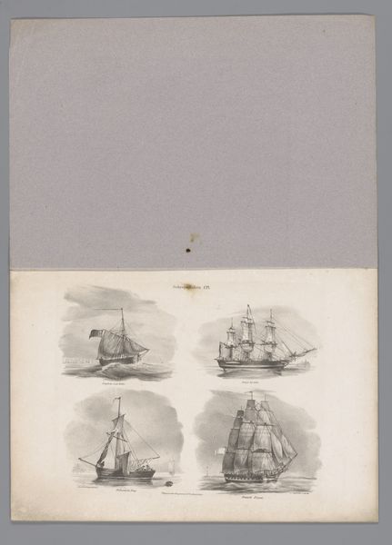 Editor: Here we have "Nederlandse oorlogsschepen vergaan tussen 10-15 mei 1940," dating from around 1945-1960 by J. Verhoeven. It's a print on paper using watercolor and ink. What strikes me is how simply, almost diagrammatically, it depicts such a dramatic event. What do you see in this piece? Curator: Immediately, I'm drawn to the visual language used here. While seemingly straightforward, the repetition of the ships evokes a profound sense of loss and historical weight. Each ship becomes a symbol, not just of naval power, but of the Dutch resistance and the sacrifices made during those dark days. Notice how they are almost like icons, lined up as if in a memorial procession. Editor: So, you’re saying the simple style isn't just a stylistic choice, but adds to the memorial aspect? Curator: Precisely. Think about the cultural memory at play. The poster was created relatively soon after the events it depicts, likely meant to rally support and cement national identity in the aftermath of war. It presents a very clean, almost sanitized version of violent events for popular consumption. Does this sanitization diminish or amplify its impact? Editor: I see your point. Maybe the clean lines help make it digestible, prevent it from being overwhelming. It allows for reflection rather than just shock. The phrase 'den vaderlant ghetrouwe / Bleef ick tot in den doet' reinforces this sense of duty and sacrifice. Curator: Absolutely. That phrase, meaning "true to the fatherland until death", underscores the ideological underpinnings. We see here how national pride is reinforced through selective imagery and language, crafting a narrative of heroism amidst devastation. Editor: That's a very different way to see this piece than how I initially approached it. I’ve definitely learned a lot! Curator: As have I. It’s always revealing to explore the deeper symbolic resonances of seemingly simple imagery.