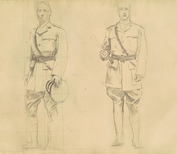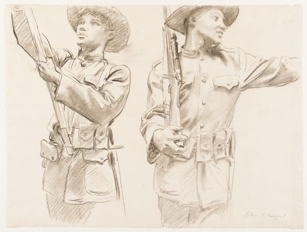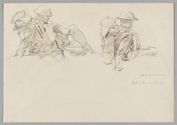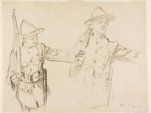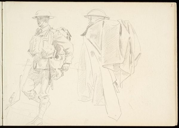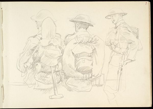 Editor: Here we have John Singer Sargent’s "Studies for ‘Entering the War,’" created in 1918 using pencil. It's a sketch showing figures in uniform. They seem weighed down, not just by their equipment but by the gravity of the situation, I suppose. What stands out to you about this work? Curator: Well, knowing Sargent, famed for his society portraits, shifted to depicting the First World War reveals much about the changing role of the artist and art itself during times of conflict. How could an artist, particularly one known for glamour, contribute meaningfully? This piece hints at his larger war commission, suggesting his move to document, in his own way, the soldiers' experience. What socio-political message might Sargent be conveying by sketching rather than painting this scene, especially given that it’s only a study for a bigger project? Editor: Perhaps the sketch form is about capturing fleeting moments of the war. To quickly record the feeling without needing to glorify it through the labour-intensive work of oil painting? The war was really transforming art; this rapid pace of recording information echoes photography’s popularity. Curator: Exactly. And notice how Sargent doesn't focus on the heat of battle. Instead, he chose these quieter, waiting moments before the action. This artistic decision tells us something about the public appetite and perhaps the official appetite too at the time for glorification of battles vs a depiction of sombre resolve. Are we meant to focus on individual heroism or a more collective stoicism in the face of industrialised warfare? What effect does that decision create here? Editor: That definitely brings into focus the soldiers' humanity, emphasizing a shared ordeal rather than some extraordinary event, challenging that idealization. Curator: Precisely. Looking at it now, it shows the institutional forces were allowing a certain level of realistic engagement from artists when conveying the truth of war. Editor: It really gives insight into how art responds to socio-political shifts. Thanks for shedding light on all that. Curator: My pleasure. It's a sobering and compelling case study, revealing so much.