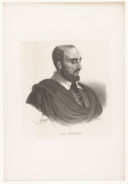 Editor: This is a 19th-century engraving, a "Portret van architect Andrea Palladio," which I believe translates to Portrait of architect Andrea Palladio. It's quite formal, almost severe, yet I'm drawn to the detail in the lines. What do you see in this piece? Curator: Well, beyond the immediately obvious representation of Palladio, I see a statement about legacy and the enduring power of ideas. Consider the medium itself – an engraving. It's a process of meticulous inscription, a permanent mark-making. Does that tell you something about the intentions behind the work? Editor: That it's meant to last? That Palladio's impact was meant to last? Curator: Precisely. Palladio wasn't just an architect; he codified architectural principles that have resonated through centuries. Notice the geometric order implied, even in this portrait. His architecture valued symmetry and proportion, drawing inspiration from classical antiquity. This image functions, then, as more than a likeness. What symbols here speak to that idea? Editor: Maybe the controlled lines of the engraving, mimicking architectural precision? Or the gaze, very direct, suggesting authority? Curator: Excellent. And beyond that authority, the engraving style evokes a connection to the past, to earlier printed portraits, anchoring Palladio within a tradition of great thinkers and builders. It places him in conversation with cultural memory itself. It makes you wonder who commissioned this print, doesn’t it, and why. What story did they wish to tell? Editor: I hadn’t considered all those layers! It’s amazing how much can be conveyed through what seems like a simple portrait. Thanks. Curator: Indeed. Each line holds history, perception, and aspiration. Examining art through these lenses enriches our experience.