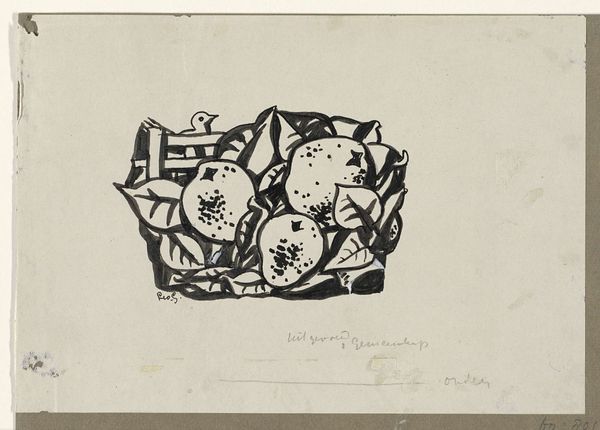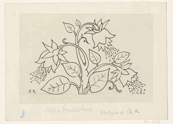 Curator: Before us is a drawing crafted in ink, named "Bloem met een libelle" and believed to have been created sometime between 1891 and 1941, courtesy of Leo Gestel. It resides here at the Rijksmuseum. Editor: Ah, it’s got this breezy, carefree feel! Like a doodle you'd find tucked in the corner of a poet's notebook. Simplistic, but also very evocative... it makes me think about fleeting summer days. Curator: Indeed. The stark linearity pushes us towards appreciating its connection to Art Nouveau. The abstraction here can be read as pushing against representational conventions prominent in late 19th-century academic art—arguably an important statement. How do you respond to that positioning? Editor: Mmm... that's an interesting take. To be honest, my mind doesn’t jump to socio-political rebellion, I get something that feels far more childlike and innocent from those unpretentious lines. I feel Gestel is saying something simpler; like observe how magical nature can appear. Curator: Children's drawings were, of course, heavily championed by the avant-garde as honest and raw—untouched by social training. What do you think of the single ink medium here? How does the flower, positioned as the support for the dragonfly, represent perhaps how fragile beauty truly is, even that seemingly simple composition? Editor: Absolutely, it's fascinating how the limitations in one medium can amplify impact; that lone ink feels daring here. Maybe that's because, unlike painting where the layers add robustness, any shaky, wavering line made while etching immediately becomes incredibly palpable. I'd even suggest it reflects the fragility and temporal quality of this tiny intersection—flower and dragonfly—locked in time, forever. Curator: The absence of color contributes to the formal power, but also opens questions around identity, how these are signified without naturalism... Do you get that sense too? The monochrome forces our analysis towards other avenues. Editor: Perhaps... Yet there's an openness in Gestel's lines here—they appear so self-effacing, that one has to question the strength of their 'statement' when approached via art historical interpretation. Regardless, this is a deceptively layered piece, wouldn't you agree? Curator: Very much so. It compels us to examine the historical contexts through which its deceptively basic theme may have played out in broader artistic and cultural movements of the period. Editor: Exactly! You walk away thinking that it must’ve been really nice watching that scene transpire one lovely day.