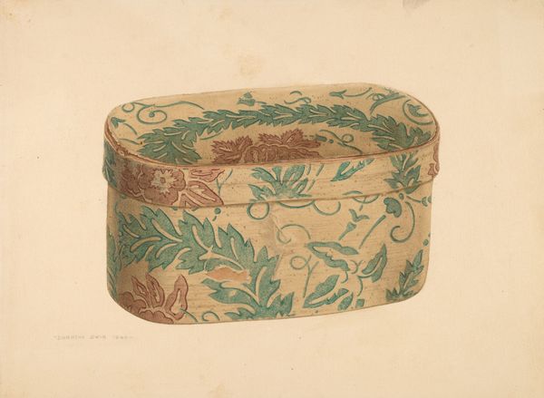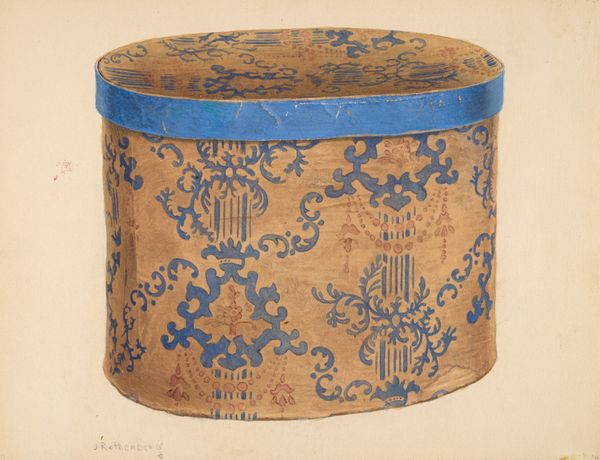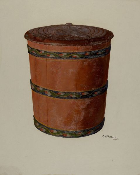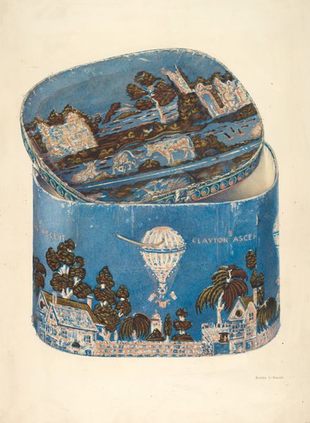 Curator: This is Walter Doran’s "Bandbox," dating from around 1939. It’s crafted using ceramic and drawing, embodying a distinct folk-art style that captures a moment in time. Editor: It strikes me as something quite charming and intimate. The colours are muted and somewhat faded, creating this sense of looking back at something cherished and used. The almost naive depiction gives it a familiar and rustic feel. Curator: These bandboxes, beyond mere storage, played a significant role in social history. Often associated with the rise of consumer culture in the 19th and early 20th centuries, they signified a growing middle class and their ability to acquire and protect personal belongings and luxury goods. Editor: Absolutely. And thinking about those goods and who had access to them…it raises some important questions. Whose stories are being told through these objects, and who remains invisible? I wonder about the women, often, who were the custodians of these domestic objects—did they have a voice in the decorations? Were they simply consumers, or active participants in the creation of meaning? Curator: Well, the artwork style does suggest an accessibility and familiarity to folk art which has been created outside formal schooling—the painting illustrates themes of railroads and landscapes of everyday scenes of the past. Such objects blur the lines between what's "art" and what's craft or utility. Editor: The imagery—horses, windmills, quaint cottages, they are creating idyllic scenes on a container labelled ‘rail road’, that juxtaposes between rural idyll and industrialisation. Who are the people using the railroad, for business or leisurely trips? There seems to be a tension, in what’s celebrated here. Curator: In my mind, the ‘Rail Road’ inscription is a pivotal element and invites questions about modernity, development and expansion— key themes when reflecting on American’s cultural growth during that period. Editor: Yes, definitely a celebration of the period. For me it is equally a material archive and a prompt to look closer to gender, social class and consumerism during that time. This 'Bandbox' carries stories beyond its apparent function.