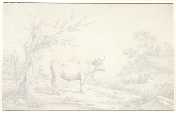 Editor: Here we have "Ram en stier in een landschap," or "Ram and bull in a landscape," created in 1823 by James de Rijk. It’s an ink and graphite drawing and, at first glance, it strikes me as a rather idyllic, peaceful scene. How do you interpret this work? Curator: The drawing offers a fascinating glimpse into 19th-century attitudes towards nature and agrarian life. Think about it: landscape art at this time wasn’t just about pretty scenery. It reflected socio-economic realities and the idealized vision of rural life many city-dwellers held. Notice how the animals appear placid and almost anthropomorphic, seemingly coexisting harmoniously. Do you think this reflects the reality of animal husbandry in the 1820s, or a more romanticized version? Editor: I'd guess it's definitely leaning toward the romanticized version. It’s a very idealized portrayal, almost pastoral. How might its creation have been influenced by, say, burgeoning industrialization? Curator: Exactly! As cities grew, these images offered a counterpoint, a nostalgic yearning for a simpler time. These images played a crucial role in constructing a national identity rooted in the land. Art like this validated the rural experience and helped soothe anxieties brought on by social change. Could we consider the imagery as conservative? Editor: In some respects, yes, reinforcing a certain social order. Looking at it now, I see that the drawing is far more than just a landscape, it is more of a historical and cultural statement. Curator: Indeed. It reminds us that art is never created in a vacuum. Editor: This discussion gave me so much to think about for this landscape. Thanks so much. Curator: My pleasure! It is exciting to discover such complexities together.
