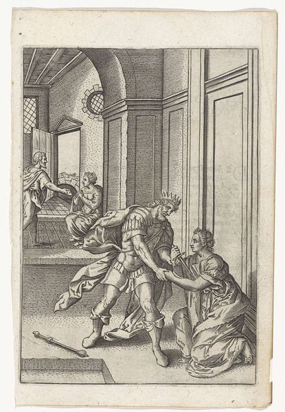 Editor: So this is Gabriel de Saint-Aubin’s “The Death of Tancred,” from 1760, done with etching and engraving. It’s quite moving—a chaotic scene of mourning depicted with very fine lines. What strikes me is the almost theatrical quality. What do you see in this print? Curator: It’s fascinating how Saint-Aubin captures that moment of profound loss. Beyond the drama, I’m drawn to the symbols. The architectural setting, while classical, feels almost like a stage, as you noted. Look at the circle in the archway – almost like a spotlight. How do you think that formal element, the oculus and classical stagecraft, might be speaking to us? Editor: Maybe it’s elevating the death, putting it on a grand, historical scale? A sense of the eternal or divine looking down? Curator: Exactly! Consider also Tancred's armor cast aside – potent symbols of relinquished earthly power. It reveals vulnerability and hints at a transition, mortality replacing heroic strength. The etching itself, with its intricate web of lines, mirrors the complexity of grief. What feelings arise for you with this representation? Editor: I think that Saint-Aubin used that medium specifically to enhance the emotive qualities of this image, maybe to show the emotional fragility or breaking point that the subjects were undergoing. Curator: The broken body, a symbol of earthly failings. And what do we do with that image today, within the memory of heroic paintings of the past? Does the image offer the audience the means to question what strength and honor truly entail? It's powerful how these visual motifs create a dialogue across centuries. Editor: It is amazing to see how many layers a seemingly straightforward historical scene can contain, isn’t it? Curator: Absolutely. Visual art acts as cultural memory, holding meaning and evoking reflection far beyond its initial creation. The image offers us an understanding of the visual culture of death and its iconography, one that’s been updated throughout generations.