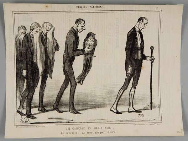 Editor: This lithograph, “The Waiter in Black Suits. Funeral of the tip box, plate 2 from Croquis Parisiens” by Honoré Daumier, possibly from 1855, depicts a somber procession. There’s a strange feeling of exaggerated sorrow; the figures are elongated and almost comical in their grief. What strikes you about the visual composition here? Curator: Indeed. Let us consider the interplay of line and form. Note how Daumier utilizes stark lines to define the contours of the figures, lending a graphic quality to the composition. The curvature of the slumped postures contrasted against the rigid verticals of their attire and walking stick creates a visual rhythm that oscillates between sorrow and satire. Editor: The ‘tip box’ they are carrying looks quite ornate for a receptacle of gratuities. And I see the text "MORT". What could the vessel and reversed inscription on the vase represent? Curator: Semiotically, we may interpret the tip box as more than its literal function. Its ornate quality is deliberately jarring. Notice also that inscription "MORT" on the vase is reversed as in a mirror, so we get “TROM”. Daumier suggests a sense of disillusionment, that things aren’t always as they seem. Consider how the stark blacks against the paper contribute to this effect. What does this restriction of value accomplish? Editor: By focusing on black and white, it intensifies the solemn mood. The lack of color highlights the stark reality of the waiters’ situation and contributes to its romantic yet gritty feel. The limited palette creates a sense of severity and the linear focus helps intensify their sad silhouettes, as it forces you to study their long, saddened forms. Curator: Precisely. Through formal analysis, we've deciphered Daumier's employment of line, form, and value as not merely descriptive elements, but as carriers of meaning that elucidate the work’s sardonic commentary. Editor: I see the artwork and this lesson differently now. Thanks for illuminating how these choices contribute to its overall impact.