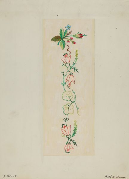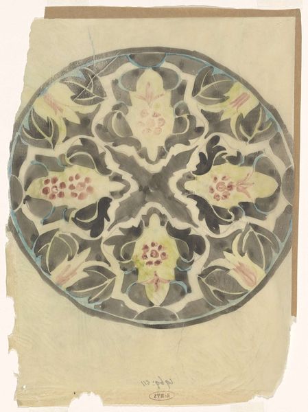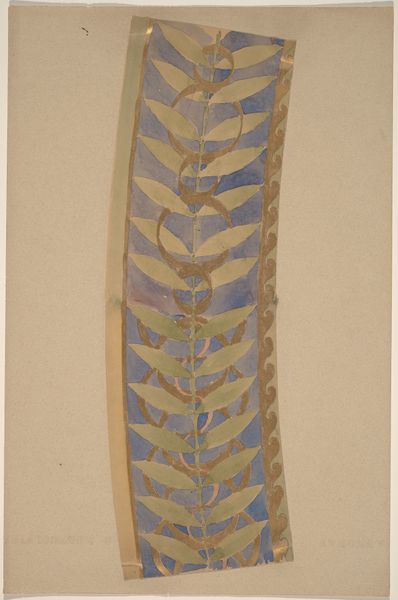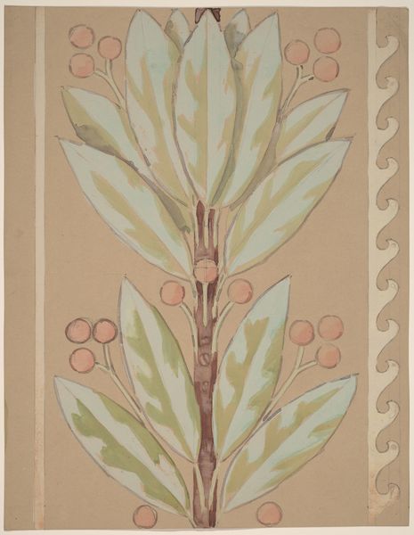 Curator: Charles Sprague Pearce's "Study for a Border Design," likely created between 1890 and 1897. It's watercolor on paper, a delightful example of Art Nouveau's embrace of natural forms. Editor: It feels muted, doesn't it? Reserved. I immediately think of old wallpapers, of patterns hinting at a life lived quietly within certain domestic confines. Curator: Exactly. Notice the stylized berries and foliage – organic shapes reduced to almost geometric simplicity, yet retaining that vital spark of life. What resonates for me is Pearce’s meticulous process: planning out the border pattern for, perhaps, a much larger, grander commission. There's beauty even in these preliminary studies. Editor: Absolutely. You get the sense of labor involved – the repeated motif, the controlled washes of color. This wasn't just inspiration; it was applied skill, a craftsman meticulously constructing something beautiful and functional. Think of all the layers of making: the production of paper, watercolor pigments, the tools used by Pearce to produce these art works. It's a chain that stretches from factory floor to final product. Curator: I agree. And in a world rapidly industrializing, the Art Nouveau movement offered a gentle, handcrafted rebellion. These designs brought nature indoors, softening the sharp edges of modern life. The symbolism, though subtle, speaks of growth, renewal, a deep connection to the earth. It’s a whispered conversation, not a shout. Editor: And those pale, almost ethereal washes… There’s a vulnerability to the medium. Watercolors on paper, in particular, lack a robust physical structure, embodying themes of ephemerality that art nouveau explores. It serves as a study in decorative art, while also demonstrating a strong sensitivity to materials and production processes. Curator: Beautifully put. It reminds me that even within ornamentation, within design meant for everyday use, there's a space for the soul to breathe. It's a fragment that contains a whole world. Editor: Right, seeing beyond the surface invites a consideration of the human touch that goes into even something as ostensibly ‘decorative’ as a border design.