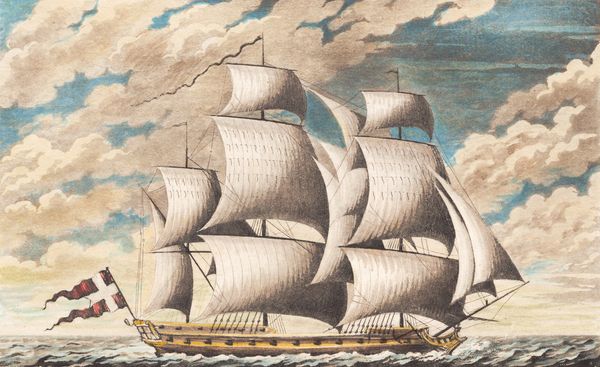 Editor: We’re looking at "A Danish Leaship, Seen in Lee, with Side Wind" created in 1805 by Niels Truslew. It seems to be a watercolor painting, combined with aquatint and colored pencil, that depicts a fully rigged ship sailing on the open sea. The overall feeling I get is one of adventure and perhaps a little bit of the unknown. What strikes you most about this work? Curator: The most prominent thing for me is how this image weaves together pride and vulnerability. Ships, especially in the Romantic era, often stood as potent symbols. What does a ship signify to you? Editor: Independence, exploration, but also a sense of being at the mercy of the elements. Curator: Exactly. The Danish flag flying from the mast evokes national pride and maritime power, a desire to project strength. However, notice how the ship is positioned "in lee," sheltering from the wind. The ship is not sailing directly into the wind. This choice hints at the unpredictability and challenges faced at sea. Do you sense any tension between these two symbols? Editor: Yes, absolutely. It is like the painting recognizes the reality of the ship's journey and what might be required for it to survive. Curator: Furthermore, water itself is laden with symbolic meaning. How has the depiction of the sea been used as a symbol across different historical eras? Consider shipwrecks, the Titanic, or even the imagery in religious art like the parting of the Red Sea, what cultural themes link these events to a specific relationship to water? Editor: That's really insightful, and gives me a much broader sense of this piece. Thanks for opening my eyes to the symbolism at play. Curator: And thank you. Examining Truslew's ship through a symbolic lens reveals layers of meaning we might have missed at first glance.