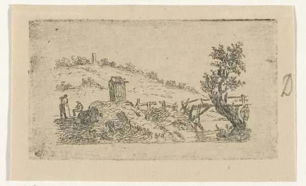 Esaias van de Velde created this print, "Farm by a Canal," using etching techniques. Notice how the composition guides your eye from the darker, densely etched trees on the left to the lighter, more open sky on the right. The structure of the image is built on contrasts: light versus dark, open versus closed spaces, and natural versus man-made elements. These contrasts might suggest van de Velde's exploration of the relationship between humanity and nature, a common theme in Dutch Golden Age art. See how the figures are placed at the lower right, almost as an afterthought. It's a study of how the natural and built environments shape human experience. The etching's lines, though delicate, create a sense of depth, pushing the background further away and emphasizing the flatness of the picture plane. It invites us to consider how art constructs our understanding of space and reality, challenging us to reconsider our perceptions.