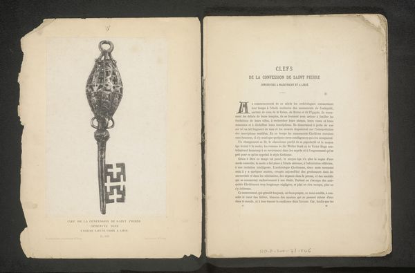Editor: Here we have an image of, seemingly, an open book, in which a Y-shaped textile is represented. It’s titled "Ofrey-borduurwerk in de vorm van een Y," attributed to Isabel Agnes Cowper, dating from before 1874. Considering the context of display, how do socio-political forces shape our understanding of religious objects like this? Curator: That’s a very insightful question. The image itself presents several layers for investigation through social, cultural and institutional history. The 'Ofrey-borduurwerk' - essentially, embroidery on a liturgical vestment- holds immense symbolic weight. These textiles were often commissioned by wealthy patrons or religious institutions, reflecting not only their devotion but also their social status and political influence. How do you think this specific example speaks to power dynamics within the Church at that time? Editor: I suppose that the opulence implied by such intricate embroidery suggests a significant investment of resources, reflecting the Church’s wealth and its authority to commission such works. Is the photographic reproduction significant, as well? Curator: Exactly. The photograph's presence within a book speaks volumes about the democratization of art access. Prior to widespread photographic reproduction, such detailed visual information would only be available to those with physical access to the textile or perhaps hand-drawn reproductions. Think about who might have consumed such publications and why. Was this about scholarly study, artistic inspiration, or perhaps even the legitimization of certain ecclesiastical narratives? How do you think the act of documenting these artifacts shaped their reception and interpretation? Editor: It is fascinating how one can reflect on cultural meaning. So by disseminating images like these through printed material, one creates narratives that will likely survive longer in comparison to hand-drawn depictions, or even in comparison to not having records at all! Thank you. Curator: Absolutely! Examining the "life" of an image is invaluable in understanding its historical impact and enduring significance. This textile shows it really comes down to the art, it will come through different stages depending on politics and social views, however, it always stays around in new ways!