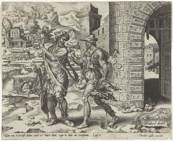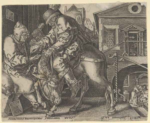 Heinrich Aldegrever created this engraving, "The Good Samaritan Paying the Innkeeper," part of "The Parable of the Good Samaritan," sometime in the first half of the 16th century. The composition divides into distinct zones of action, setting up contrasts that drive the narrative. Observe how the left side bustles with figures and dynamic gestures as the Good Samaritan settles his account with the innkeeper. In contrast, the right side is dominated by the inn's architecture. Notice how Aldegrever contrasts the rigid geometry of the building with the vulnerable figure of the wounded man in the lower right corner, who is being cared for. Aldegrever uses these contrasting visual elements to explore themes of social responsibility and human compassion. The stark lines of the engraving lend a sharp, almost moralizing tone to the scene. The precise details in the figures' expressions invite us to consider the internal states and motivations of each character. The formal qualities of the print serve to underscore the parable's message, inviting ongoing reflection on how we interpret and embody its lessons in our own lives.