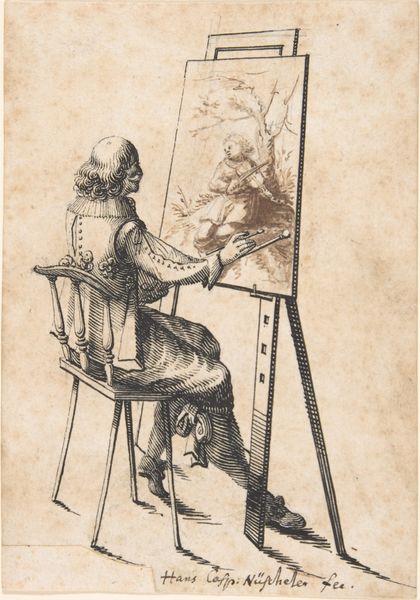 Robert Brichet created this print of a painter seated at his easel sometime between 1750 and 1850. The image is titled "Le Peintre," or "The Painter," in French. The print offers a glimpse into the world of artistic production during a time when art academies were solidifying their influence. Look closely, and you'll notice the artist's attire, the tools of his trade, and the subject of his painting; each aspect reflecting the social status and cultural values of the time. The artist appears somewhat disheveled, in contrast to the idealized images often produced at the time. This perhaps, offers a commentary on the artist's own position within the art world. Consider how Brichet, as an artist himself, might be using this image to reflect on the role of the artist in society, and perhaps also to question or subvert some of the prevailing norms of artistic representation. What does it mean to depict an artist who is both creator and subject, both in control and perhaps also a little vulnerable?