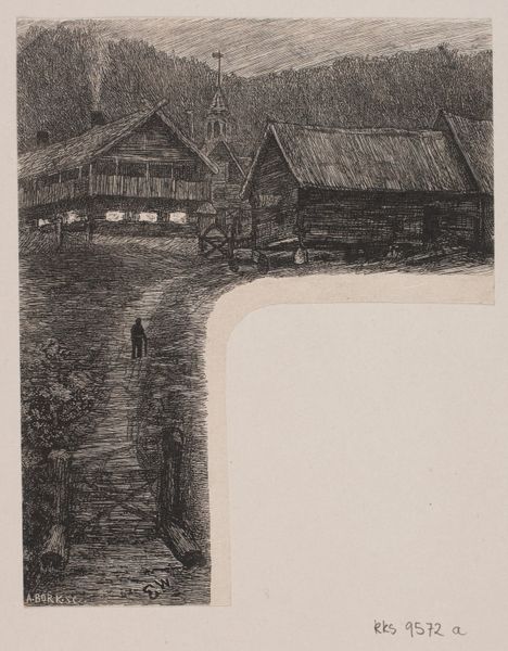 Curator: Welcome. Before us is "Landschap met sloot", or "Landscape with Ditch", a work created through etching, drawing, and printing techniques. It resides here at the Rijksmuseum and is attributed to Willem Adrianus Grondhout, dating from around 1888 to 1934. Editor: Oh, what a strangely lovely little world he’s crafted here. The density of the marks, it almost vibrates. I feel like I’m peeking into a dream. There’s a quiet labor happening on the roof that makes me think about our responsibilities. Curator: Grondhout situates this landscape within a particularly compelling time frame for the Netherlands. Following the late 19th-century Hague School movement, artists wrestled with capturing Dutch identity and the rapidly modernizing landscape. Editor: It's more felt than described, isn't it? Look at the windmill in the top right! The blades disappearing off the top. So much of it exists just outside of our vision, only implied. The textures are working hard. What do you make of it? Curator: The subject—a solitary figure atop a humble structure, seemingly isolated amidst the broader landscape—resonates with certain social and philosophical ideas around rural labor. I'm thinking of the post-impressionistic yearning for a simpler life amid industrialization and the attendant class disparities. The laborers, the toilers. Editor: True! And what is he actually doing? Mending something? Tending? Toiling…yes. I love that. He almost blends in. Maybe that’s why I like it, this idea that we are the landscape too, mending it as much as we rely on it for support. It brings the focus back to us. Curator: Exactly. While we can read the social dimensions and consider the impact of early industrialization on art of this period, Grondhout's stylistic choice leans towards abstraction, so we feel something rather than immediately recognize a concrete claim. The "Dutch-ness" becomes internalized, more symbolic, less straightforward. Editor: I love art that works on our subconscious that way. That ditch or canal winds through so much of the image. We get lost there. That figure working almost out of sight… there’s more there than you can see at first glance. Curator: Ultimately, "Landschap met sloot" challenges us to rethink romantic notions of landscape, probing social identity and placing a unique aesthetic experience front and center. Editor: Yes! It's a landscape and a mindscape too. I love seeing how the past speaks so clearly to our present.