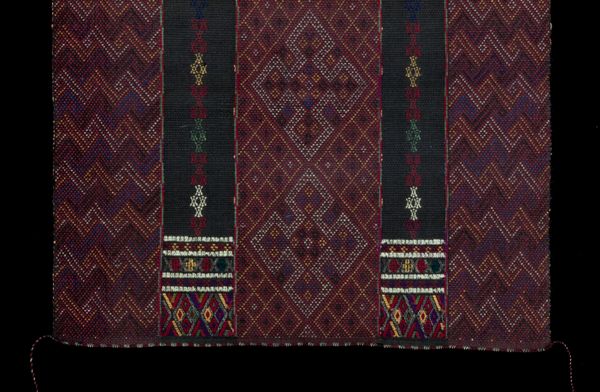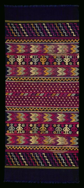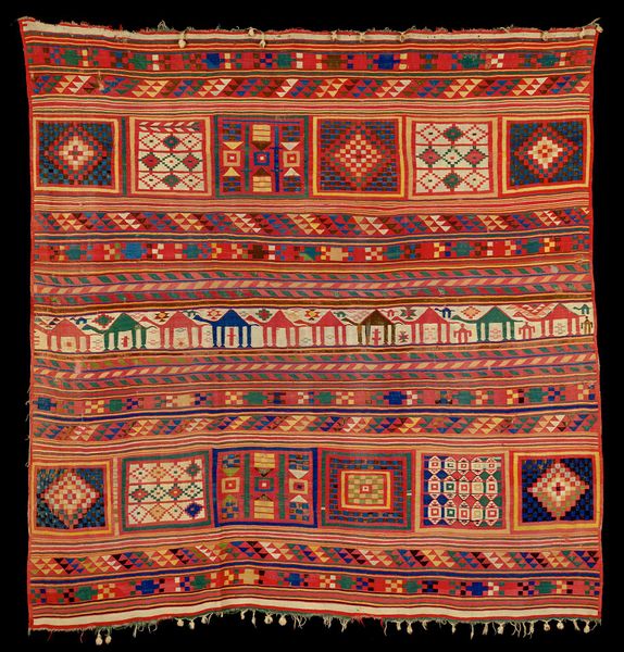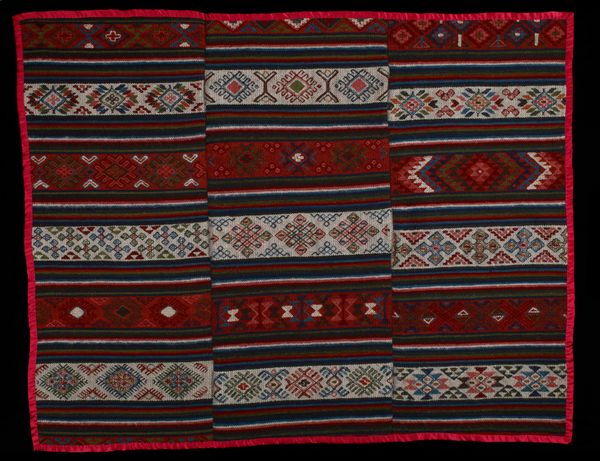 Editor: Here we have a "Room Divider" made around the 20th century from cotton and textile fiber art. At first glance, the geometric patterning and vibrant colors of the piece suggest a complex, yet organized structure. How do you interpret this work? Curator: The immediate formal qualities apparent are the pronounced geometric configurations and their serial repetition across the plane. This textile engages fundamentally with the relationship between color and form. Consider the interplay between the warm reds and the cool blues and greens; how do these color contrasts structure our perception of the piece as a whole? The chromatic organization imposes its own rigid structure. Editor: I see what you mean, especially with how the geometric forms play against the blocks of solid color. It seems very carefully constructed. Curator: Exactly. Each color and shape works in harmony within its set boundaries to reinforce the internal order. And note, too, the deployment of various tactile elements – fringes, tufts – operating alongside the interplay of textures on a purely formal level. What effect do you feel these textural diversifications yield within the overall composition? Editor: I hadn’t considered texture but now I see how it is thoughtfully placed between the patterns and blocks. This is very engaging; thanks! Curator: Of course. Close inspection reveals a highly ordered structure that prioritizes the formal dialogue. Through an exercise of decoding forms we start perceiving the deeper logic governing the entirety. I hope this exploration into structure opens future paths for deciphering other artifacts in your life!