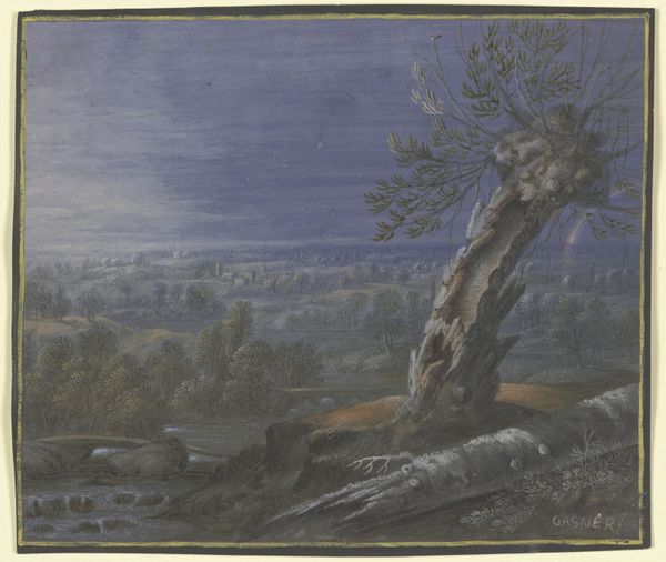 Editor: So this is Adam Elsheimer’s, *Landscape with the Good Samaritan*, an oil painting, dated sometime between 1600 and 1660. The muted color palette gives it quite a serene feel, almost dreamlike. How do you read this work? Curator: The structure relies heavily on the contrast between the dark foreground, dominated by organic forms of trees, and the gradual opening up of the landscape toward the distant horizon. Notice how the artist employs subtle shifts in tonal value to create depth, guiding the eye through distinct planes. Editor: The trees really do seem to frame the action… almost like a stage? Curator: Precisely. And what of the central tree, dominating the middle ground? Note its density and how it bisects the composition, acting as a visual anchor. The rendering is meticulous, almost scientific in its precision. What effect does that level of detail have on your perception? Editor: It almost feels like the figures of the Good Samaritan and the victim are secondary… subservient to the structure. That’s really fascinating to observe how they relate and add a touch of human narrative to what seems more of a geometrical investigation of the natural world. Curator: A keen observation! And notice how the artist manipulates light - especially how it strikes certain leaves while casting others into shadow. That interplay does a lot of work creating visual interest within the trees alone. How does this more formal reading shift your perception? Editor: It's made me really appreciate the artist's focus on composition and the pure mechanics of making the work of art rather than simply telling the story, but rather, by orchestrating form, light, and color to tell a specific visual tale, revealing the beauty and drama in the smallest detail. Curator: Indeed, a focus on structure yields fruitful insights.