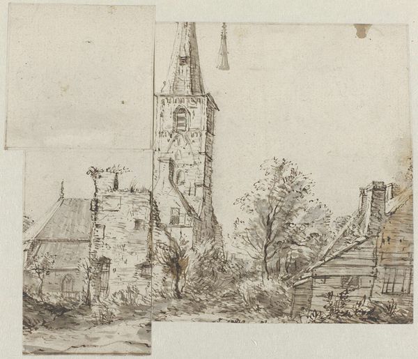 Curator: This delicate pencil and etching drawing, titled "Partie am Ausfluss der Wisper," which roughly translates to "Scene at the outflow of the Wisper River," by Peter Becker, transports us to a quaint riverside village. Editor: It’s wonderfully evocative. The softness of the lines gives it a dreamlike quality, like a half-remembered place from childhood. It feels peaceful, almost melancholic. Curator: Becker’s choice of plein-air, which focuses on open-air work, aligns with the broader Romantic movement fascination with nature. These direct sketches become essential reference points. The very act of sketching outside was laden with symbolic value. It reflected a more authentic and direct encounter with nature, untainted by urban life. Editor: I see the quiet confidence of enduring archetypes, though. The steeple, for example—that spire has always pointed humanity toward the heavens, towards faith. Then you have the bridge over water, a classic symbol of transition, of moving from one state to another. Even the trees feel significant; they represent organic growth, stability, deep-rooted connection. Curator: Right, and consider the Wisper river itself. Rivers in art often symbolize the passage of time, change and constant flux. In terms of political history, it represents how boundaries have developed through urbanization and settlement around these water sources. Editor: It gives this scene more weight, beyond just a pretty view. I am drawn to how this depiction of water also echoes psychological dimensions. Reflective surfaces can represent introspection or unconsciousness, and considering Becker created this work in situ allows the view to perceive beyond the architectural constraints into its internal form. Curator: Well put. In its deliberate understatement, Becker seems to invite contemplation. He offers us a glimpse into the relationship between rurality, spirituality, and the ever-changing landscapes of nineteenth-century Europe. Editor: Exactly. We’re left pondering what “home” truly means—not just a place, but also an accumulation of collective beliefs, environmental transformations and continuous transition into the future.