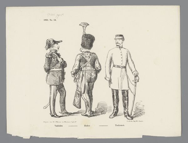 Editor: This is "Spotprent op de aflossing van de wacht van 1862 op 1863," a drawing made in 1862 by Johan Michaël Schmidt Crans, done with pen and pencil. It depicts soldiers; there's something quite humorous about the rendering. What can you tell me about it? Curator: For me, the interest lies in understanding its production as part of a wider network. The drawing itself, rendered with delicate lines and visible pen strokes, indicates its function perhaps as a preliminary sketch, something not meant for high art status. Editor: Interesting. Curator: Think about the paper, the ink, the distribution channels for political cartoons in 1862. Each element involves labor, trade, and social commentary. Are we looking at a mass produced print designed for quick consumption and disposal, or a carefully crafted limited edition? The textual reference "P. M. Zbys" written on the drawing possibly points to the artist using materials derived or directly procured from the P. M. Zbysco company. The choice of these resources points to what then could be called the quality of materials and accessibility and even perceived utility of the image to the consumer and its maker. Editor: So, by focusing on the materiality, we move beyond the simple image of soldiers? Curator: Precisely! Consider also the economic climate that fostered the production of these drawings. Were there specific paper manufacturers aligned with certain political factions? Were artists reliant on particular distributors who might have influenced the content? What processes of labor were involved in their reproduction? These material considerations enrich our understanding of its cultural significance. Editor: That really changes how I see it. Looking at the 'how' and 'why' of its making, the image speaks to its time period on a much deeper level. Thanks for pointing out those details! Curator: My pleasure! By analyzing material choices, we uncover complex socio-economic relations embedded within seemingly simple sketches.