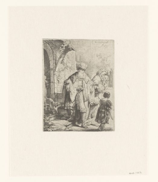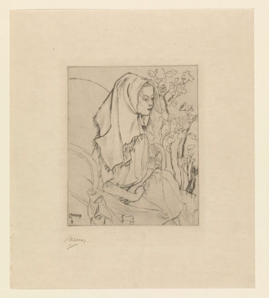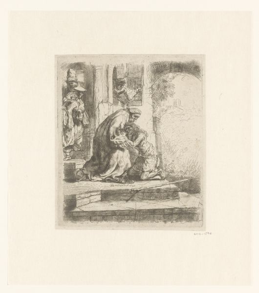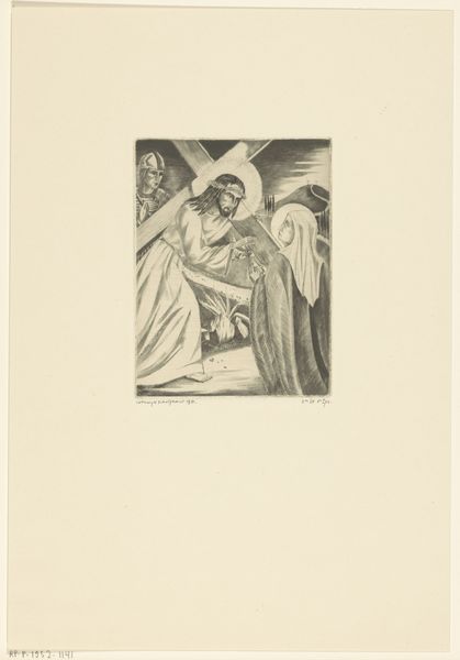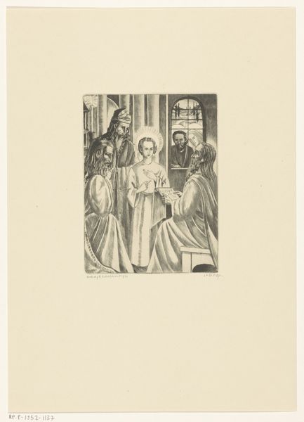 Curator: This is Lodewijk Schelfhout's "Jozefs droom," or "Joseph's Dream," an etching from 1931 currently held at the Rijksmuseum. Editor: The immediate impression is one of quietude. The muted tones of the etching contribute to this feeling, creating a scene bathed in a subdued, dreamlike light. Curator: Indeed. Schelfhout captures a critical moment in the Christian narrative. Joseph, having learned of Mary's pregnancy, is visited by an angel in his sleep, who assures him of Mary's purity and the divine nature of the child she carries. It addresses the patriarchy, looking at how social expectations shape family structures even through the supernatural. Editor: The composition strikes me. The angel, rendered with an almost classical smoothness, gently guides Joseph from his slumber, the very lines are softer where their bodies almost touch, marking an encounter of the material with the ethereal. Curator: Precisely. Note how Joseph is framed. He's seated in what appears to be an outdoor space, but still confined, representative of the social constraints and expectations placed upon him and Mary during this period. It's a moment pregnant with socio-religious consequences. The angel’s gentle gesture almost seems like it's a hand removing these burdens and bestowing protection. Editor: Schelfhout's mark-making is subtle, particularly within the angel's wings and Joseph’s beard, but very decisive. This kind of precise linework evokes, I think, a contemplative, almost mystical atmosphere. Curator: It's also a powerful visualization of faith. Schelfhout situates the divine within the everyday. Consider also the backdrop -- a conventional architectural construction representative of patriarchal order. And right beside Joseph's seating is placed a jug, and on the other side, in contrast, there's broken, disordered building implements – the message to me being one of domestic realignment. Editor: Yes, there's a sense that Joseph is also presented as the vulnerable man here, troubled, in repose, deeply in thought. His submission contrasts greatly with the winged messenger of light behind. Curator: Ultimately, Schelfhout invites us to reflect on themes of faith, acceptance, and the radical social implications that faith sometimes demands. Editor: It’s remarkable how a work composed with such limited means is charged with profound meaning, using a masterful balance of light and shadow, form and tone to guide our contemplation.