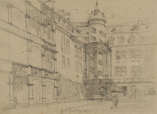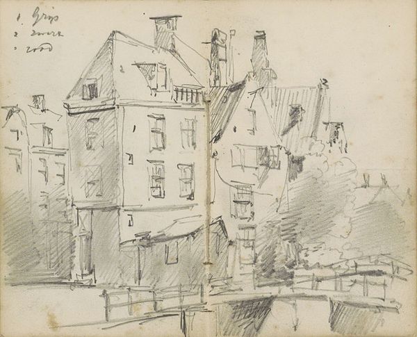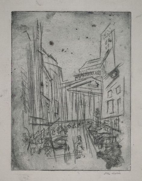 Curator: This is L.S. Lowry's 'Study for ‘Dwellings, Ordsall Lane, Salford’. Editor: Oh, it feels…bleak, doesn't it? The buildings loom, but there's a strange energy with all those matchstick figures scurrying about. Curator: Indeed. Lowry, born in 1887, often depicted the industrial landscapes of Northern England. Here, he sketches the Ordsall Lane dwellings using pencil on paper, a technique revealing the underlying structure. Editor: I notice how he plays with perspective, flattening the space, making the buildings seem almost like cardboard cutouts. The repetition of windows and the way the street narrows…it's quite claustrophobic. Curator: It's a study, of course, allowing us a glimpse into his artistic process, his focus on the architectural forms and the human condition within them. He’s really stripped it back to the bare bones. Editor: Those bare bones certainly convey a particular mood. It's a compelling, if somewhat somber, reflection on urban life, even in this preparatory stage.