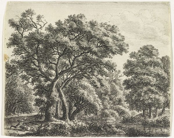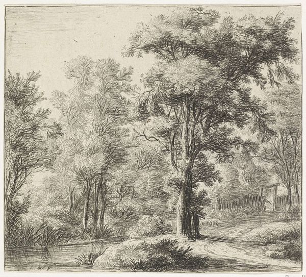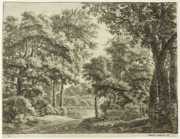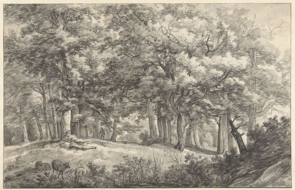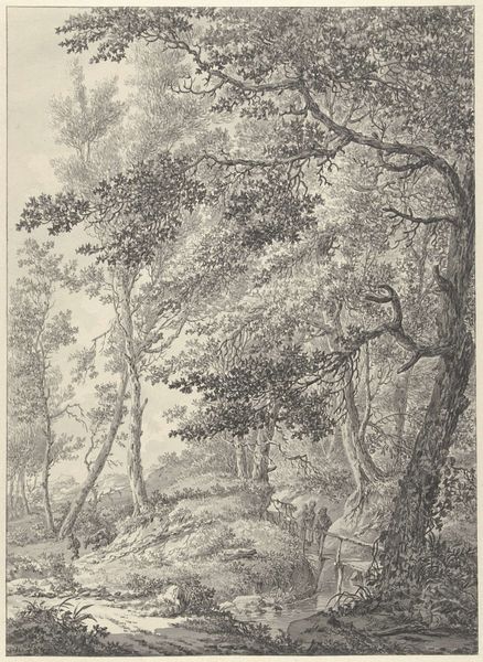 Editor: We're looking at "Bosgezicht," a pencil drawing, attributed to Engelbert Michaël Engelberts, dating roughly between 1783 and 1843. It strikes me as very detailed, almost photographic in its realism, despite being made solely with pencil. What aspects of its creation or context stand out to you? Curator: For me, the fascinating aspect lies in understanding *why* Engelberts chose pencil as his medium and the implications of that choice during this period. Pencil wasn’t always viewed as suitable for 'high art.' Examining its accessibility and portability helps us consider the democratization of art production. Was this a preparatory sketch, or a finished work intended for sale or private enjoyment? The labor involved in rendering such detail with pencil also demands consideration. Editor: That's a really interesting point – the choice of pencil itself as a statement. How would that democratisation have played out? Curator: Think about the rise of industrial production making pencils more readily available. Simultaneously, you see a growing middle class with leisure time and disposable income, fueling the market for landscape art. Pencil sketches become accessible to amateurs, blurring the lines between professional and hobbyist artistic practices. Are we looking at a reflection of a shifting social landscape in the artwork’s materiality? What do you think? Editor: So it's less about the inherent artistic skill, but rather what the very act of picking up a pencil might have signified in that moment. The subject matter too… forests becoming places of leisure and artistic engagement, as well as sources of timber. It changes how you see the artwork. Curator: Precisely! The materials themselves and their mode of production become integral to understanding the piece's meaning and social context. It forces us to question traditional notions of artistic genius and instead focus on the socio-economic conditions that enabled this work to exist. Editor: I never considered landscape art through this lens of materials and class. Thanks, that's a really thought-provoking perspective!