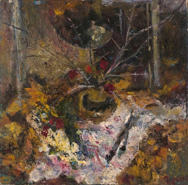 Curator: I’m struck by how ephemeral the whole image seems. It feels less like a solid, permanent portrait, and more like a memory glimpsed through a rain-streaked window. Editor: Indeed, Pierre Bonnard's oil painting, "Young Girl with Umbrella," created in 1894, captures precisely that fleeting moment. We observe not so much the individual, but the overall sensation. Curator: You see it in the impasto, right? The thickness of the paint gives the scene a tangible, textural presence. And I notice Bonnard employs very few hard lines. He suggests forms, leaving much to the viewer’s interpretation, evoking themes we recognize in his Intimist style. It feels…private. Editor: I agree. It is, as you mention, profoundly private. Consider, for a moment, the umbrella itself, the central motif, which serves almost as a symbolic barrier, shielding this girl not only from the elements, but perhaps also from the outside gaze and judgement of the society, or from the societal norms to which women were subjected. The black checks of her jacket could suggest a somber mood, which prompts one to consider constraints placed upon young women at this time. Curator: Fascinating! It’s less about pure representation and more about how clothing, in particular, acts as a symbol for protection, conformity, or even resistance. Bonnard has cleverly constructed this scene of everyday life to become ripe with deeper meaning. Editor: I appreciate the nuance in how you've situated the girl's protective stance within a social history of art. Bonnard's piece invites this reading—art rarely exists in a vacuum. Curator: This has really caused me to think differently about the semiotics of mundane objects. What appears to be simply a girl with an umbrella becomes a symbol fraught with meaning, ripe with multiple possibilities. Editor: And for me, it reinforces how artists of that period, particularly Post-Impressionists, were actively reflecting and subtly critiquing aspects of the rapidly modernizing world around them.