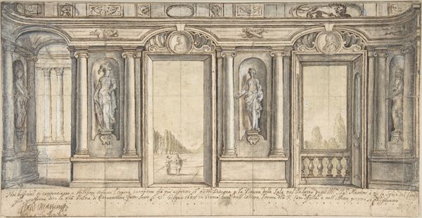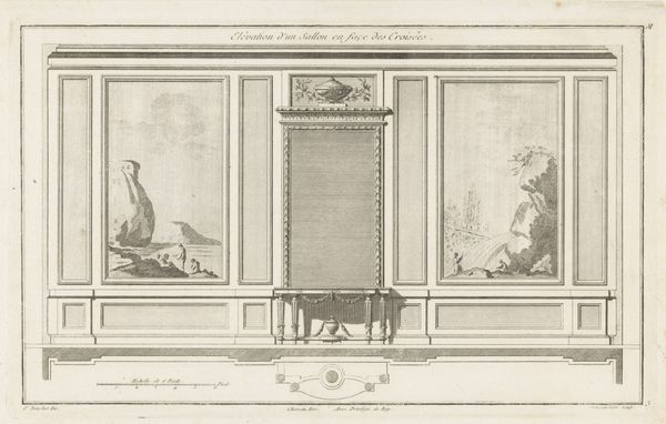 Curator: The engraving before us is titled "Vestibule," designed in 1767 by Jean Francois de Neufforge. Editor: It has a strikingly cool tone. A precise study in line and form that gives the suggestion of monumentality. The architecture reminds me of a stage setting with a central, imposing entrance flanked by quieter spaces. Curator: Precisely. Neufforge was known for his architectural fantasies, documenting them through meticulous drawings, etchings, and engravings like this. Notice the symmetry and order characteristic of Neoclassicism. Editor: Yes, and these aren’t merely doors, are they? With the portrait busts and urns above, the statuary—these become statements of status. The composition privileges power. Who inhabits, or more importantly, who is *denied* access to such a grand space? I think of gated communities today. Curator: An astute reading. One can view these design engravings through a critical lens, seeing these Neoclassical ideals representing a world carefully managed along clear, class-based boundaries. Editor: Indeed. It's an invitation to participate in a particular fantasy of aesthetic superiority, one expressed through very specific visual conventions. It feels instructive somehow, that such imagined places were once etched with this fine detail. Curator: Considering how these design ideas took hold during Neufforge's time helps us recognize the lingering influences today. Editor: It is a reminder that form follows ideology, even within these very exact linear configurations. Thank you, this look at 'Vestibule' gives cause to reconsider such enduring and aspirational architectures.