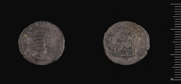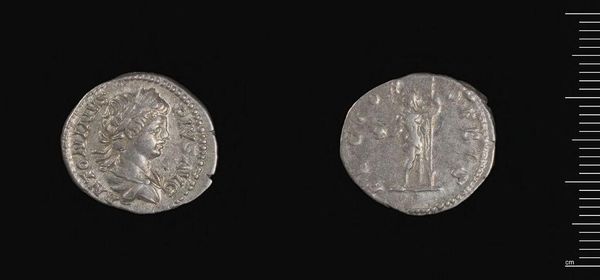 Editor: Here we have a Denarius of Elagabalus. It’s small, silver, and from, well, the time of Elagabalus. I find the portrait on the front so severe. What do you see in this piece? Curator: Ah, yes, Elagabalus. He certainly made an impression. This coin, really, is a carefully crafted piece of propaganda. The stern portrait? A deliberate attempt to project power and legitimacy. Notice how the reverse depicts a religious figure? Editor: Is that Sol Invictus? Curator: Indeed! Elagabalus, remember, tried to install Sol Invictus as the chief god of Rome. This coin isn't just money; it's a statement. Editor: Fascinating. It's amazing how much history can be packed into such a tiny object. Curator: Exactly! It is a portal to another time, another mindset. I love the way it makes us think about what really matters.
