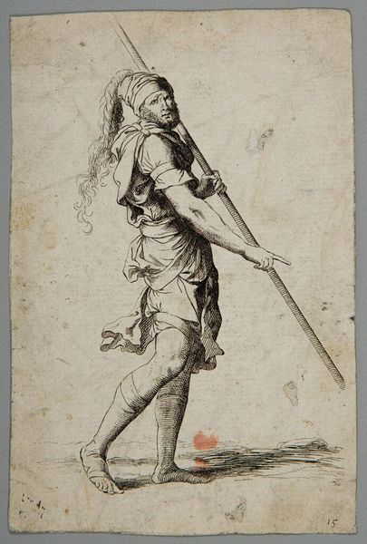 Curator: This is Salvator Rosa’s etching, "Soldier with a Lance and a Shield," currently held at the Harvard Art Museums. He was active in 17th century Naples and Rome, during the Baroque era. Editor: The soldier’s expression and posture radiate strength, but I find a certain vulnerability there as well. Rosa really conveys the burden of constant vigilance. Curator: Absolutely. Rosa’s fascination with the military extended beyond mere aesthetic interest. Soldiers, for Rosa, often represented the precariousness of power and the impact of violence on society. Editor: Considering how military exploits have historically marginalized women and other groups, do you see this figure as perpetuating or challenging those power dynamics? Curator: That’s a compelling question. Rosa’s own life reflected a kind of rebellion, challenging the artistic norms of his time. This figure could be seen as embodying both strength and a critique of traditional power structures. Editor: Seeing this piece today prompts me to think about the performative aspect of masculinity and how war continues to affect marginalized communities. Curator: The lasting relevance of this artwork, centuries later, highlights the ongoing need for critical dialogue on power, identity, and conflict. Editor: I agree. It encourages us to examine the complex layers within historical representations of strength and challenge existing notions.