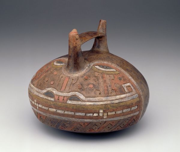 Curator: This remarkable ceramic vessel, crafted by the Nazca people between 180 and 500 AD, is entitled "Bridge Vessel in the Form of a Pair of Interlocked Fish." Notice how the two fish are joined. Editor: It immediately strikes me as whimsical, yet simultaneously monumental. Despite its modest scale, the interconnectedness of the fish and their almost watchful eyes impart a solemn quality. Curator: The dual fish form speaks volumes. Fish often symbolize fertility, abundance, and life's cyclical nature. Their interconnection suggests unity, duality, and perhaps the flow between different realms. Editor: The artist has elegantly utilized a limited palette—ochres, reds, whites—to achieve an intricate layering effect. See how those dark lines emphasize the curves and volumes? The surface almost vibrates. It makes me think of formalist sculpture, of figures like Henry Moore. Curator: Yes, and their depiction—simple yet evocative—points to an understanding of fish beyond the merely literal. Their placement conjoined with the singular connecting bridge indicates a relationship. Water may separate yet communication through ceremony or shared belief unifies. Editor: Indeed. The surface is divided into registers. There's the almost geometric, scale-like pattern along the bottom that resolves the rotundity of the overall form and the minimal representation of their facial features—that singular white circle, really arrests the gaze. It asks the viewer for their awareness. Curator: Perhaps the fish served as messengers, ferrying prayers between the earthly and spiritual planes. Remember water holds profound cultural and mythological weight, for the ancient cultures across South America and beyond. Editor: The form is deceivingly complex; notice the subtle asymmetry between the two figures. Curator: Its creation likely involved specialized knowledge and ritual practices, emphasizing its status as more than just a utilitarian object. It is a tangible representation of deeply held beliefs. Editor: Looking at it now, I'm less focused on the vessel form. It is a single entity created from similar elements that must support each other. It transcends medium. Curator: Seeing it together allows one to meditate on both connection and transformation across time and cultures.